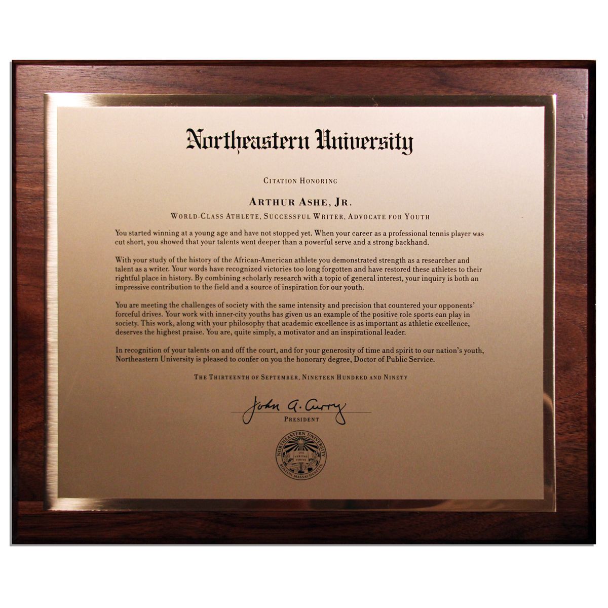 Arthur Ashe honorary degree plaque. In 1990, Northeastern University in Boston, Massachusetts conferred upon Ashe an honorary Doctorate in Public Service. Plate is a copy of the citation and reads in part, ''...Arthur Ashe, Jr. / World-Class Athlete, Successful Writer, Advocate For Youth / You started winning at a young age and have not stopped yet...With your study of the African American athlete you demonstrated strength as a researcher and talent as a writer...Your work with inner-city youths has given us an example of the positive role sports can play in society...'' The University's seal appears beneath its President's printed signature at the bottom. Dated 13 September 1990, three years before Ashe's untimely death. Alden Galleries plaque measures 12'' x 10''. Fine. With an LOA from Arthur Ashe's widow.