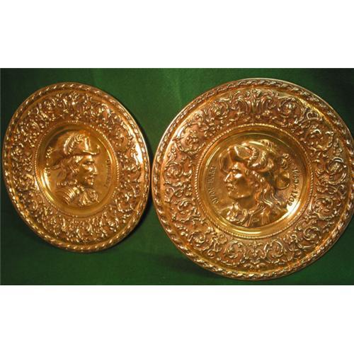 Pair of French repousse Brass decorative plates depicting 17th cent. aristocrat profiles. One plate inscribed 'Jean-Bart 1650-1702' the other 'Turenny 1611-1674' c.1850 Diam. 16ins. Price includes shipping within USA
