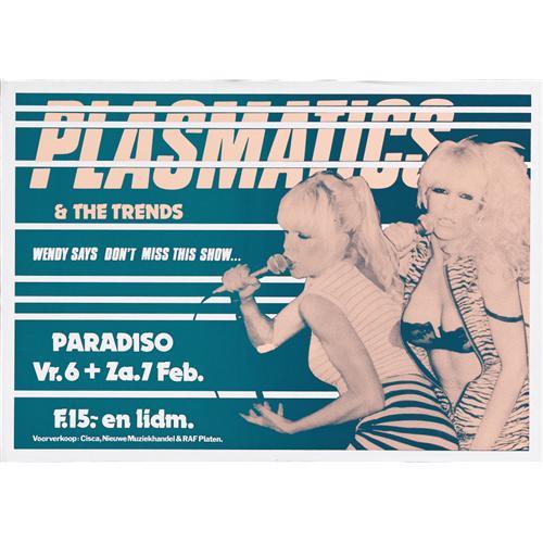 <B>Plasmatics Paradiso Concert Poster (undated, circa 1980)</B></I> Catch a double dose of the incredible Wendy O. Williams in this large concert poster from the Plasmatics on a European tour, probably around 1980. A former topless dancer, Wendy doesn't miss an opportunity to unzip her top (she's revealing her sexy black-lace bra in this one). This "Queen of Shock Rock" found life after the Plasmatics a tough row to hoe, and committed suicide in 1998. The poster (with opening act the Trends) measures approximately 24" x 17", and is in NM- condition.