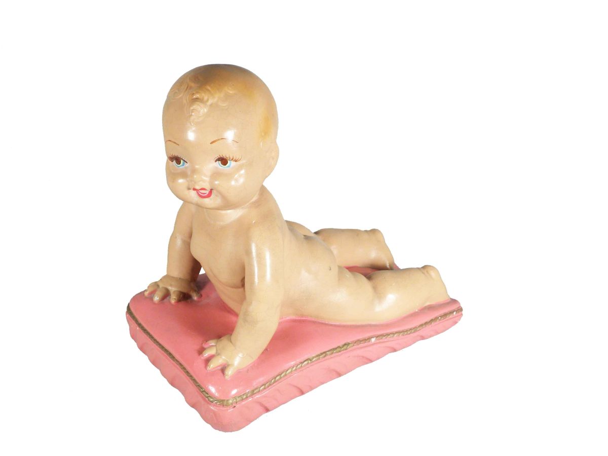 Plaster Advertising Baby Figure on pink pillow. Normal crazing and paint loss under left arm otherwise very good condition. 9 1/2 X 9 1/2 X 6 inches.