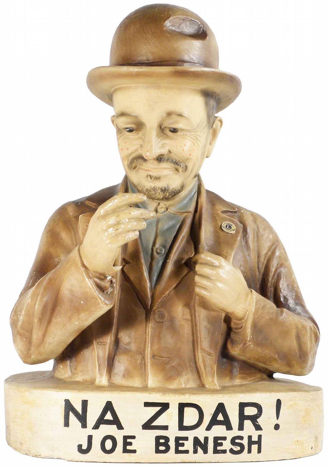 Plaster Advertising Figure, entitled, NaZdar! Joe Benesh" Man in bowler hat with Lion's lapel pin. Made by the Bohemian Statuary, Riverside, IL 1933. Very good condition. 17 X 21 1/2 X 12 inches.