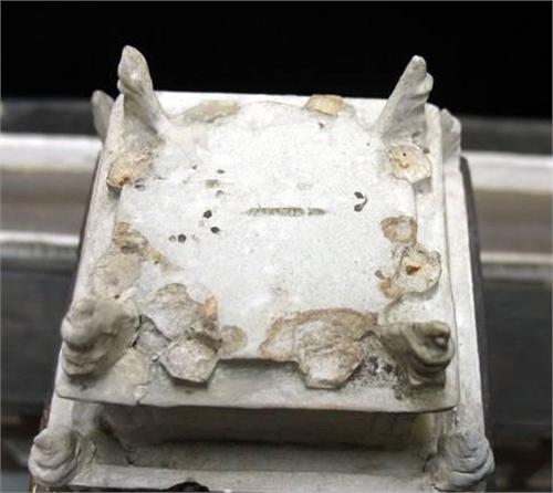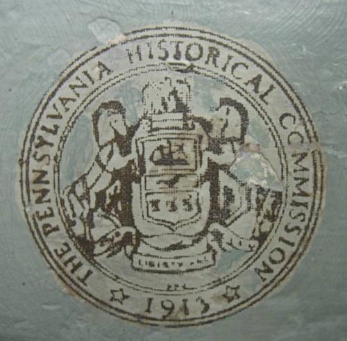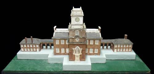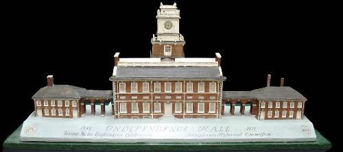Plaster scale model of Independence Hall commemorating the U.S. Constitution Celebration by the Pennsylvania Historical Commission; impressed W. A seal District 15 Pittsburgh Pennsylvania; mounted on wooden base; C.1937; measures 17" high x 40" x 15 1/2" (chips on top of clock tower; weathervane on finial missing from catwalk)