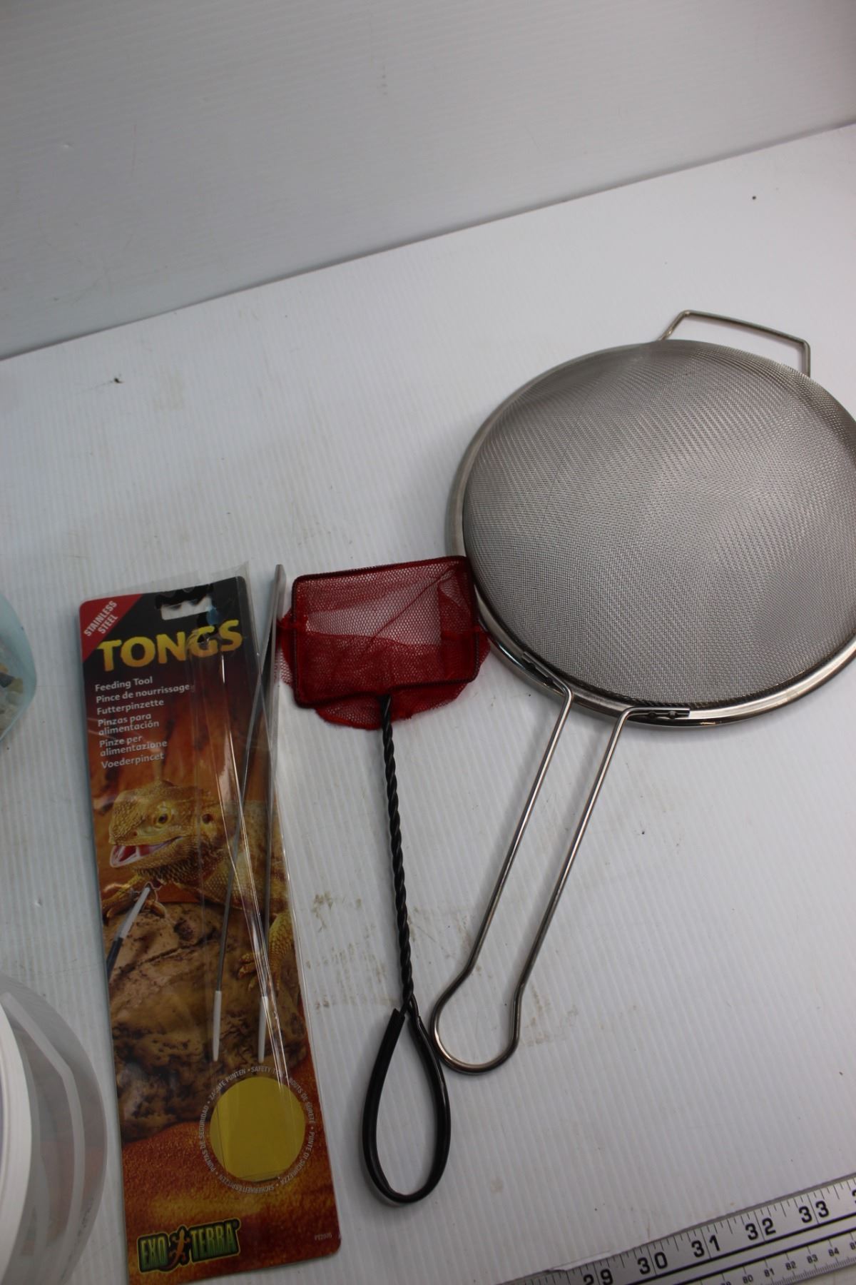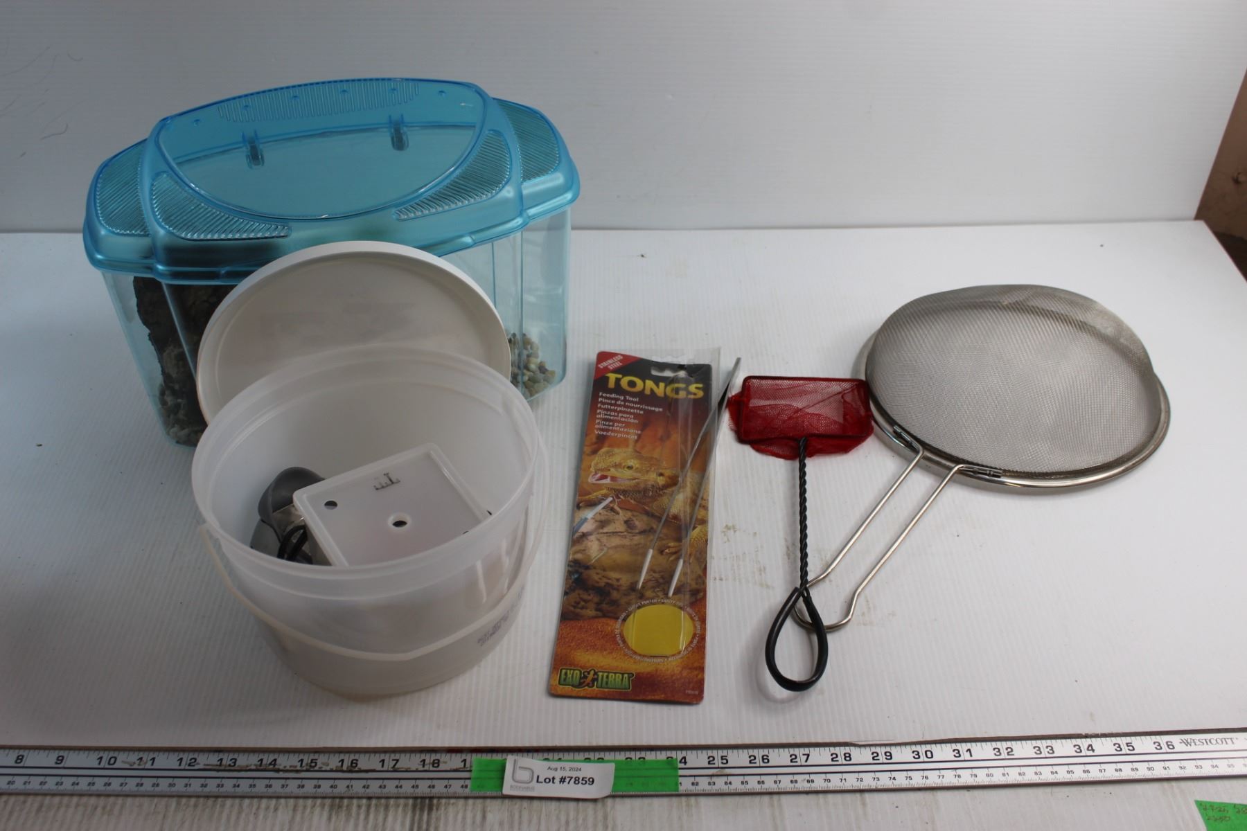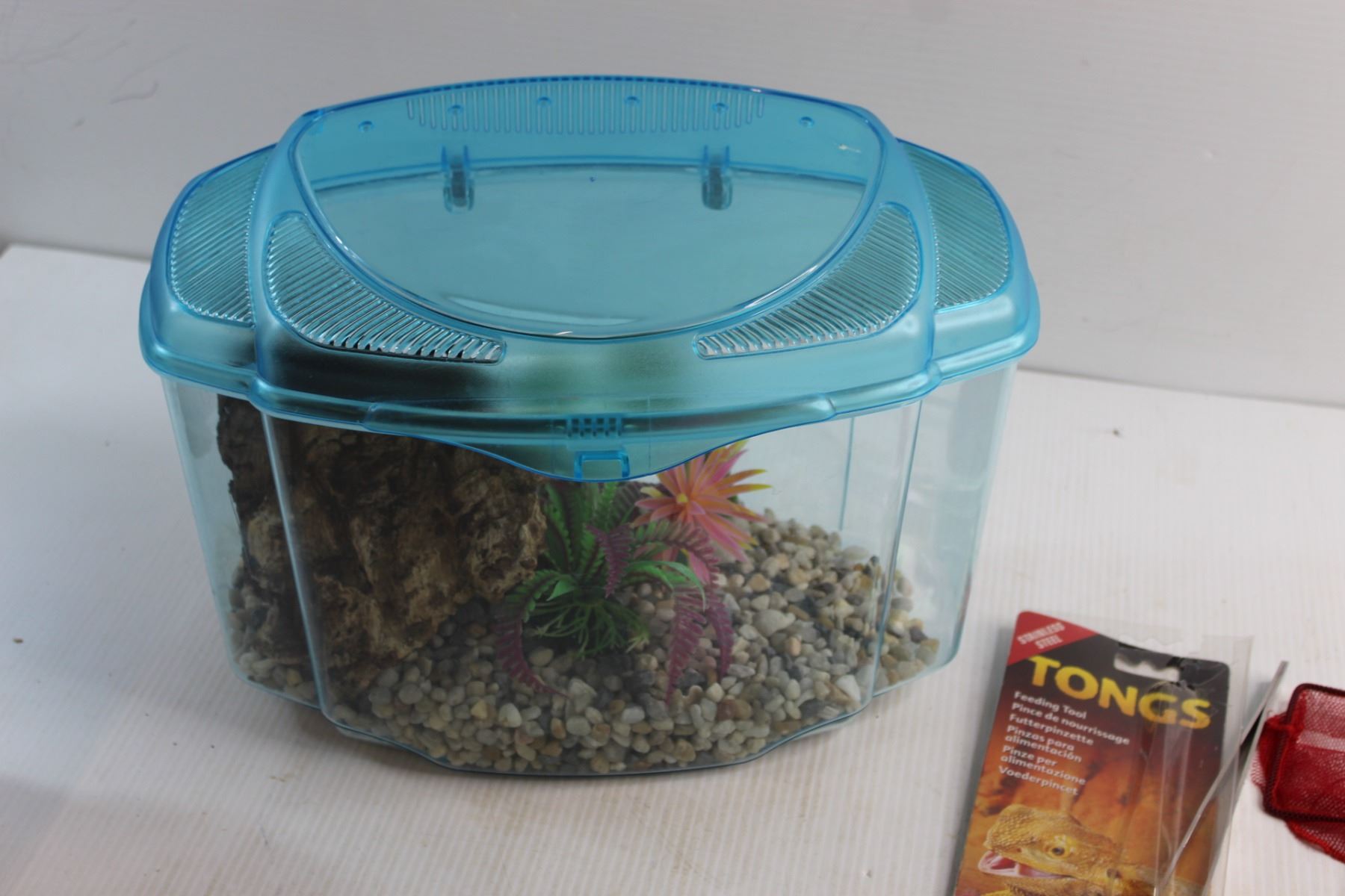 Plastic Aquarium, Strainer, Fish Scoop, Tongs Feeding Tool and Assorted Items
