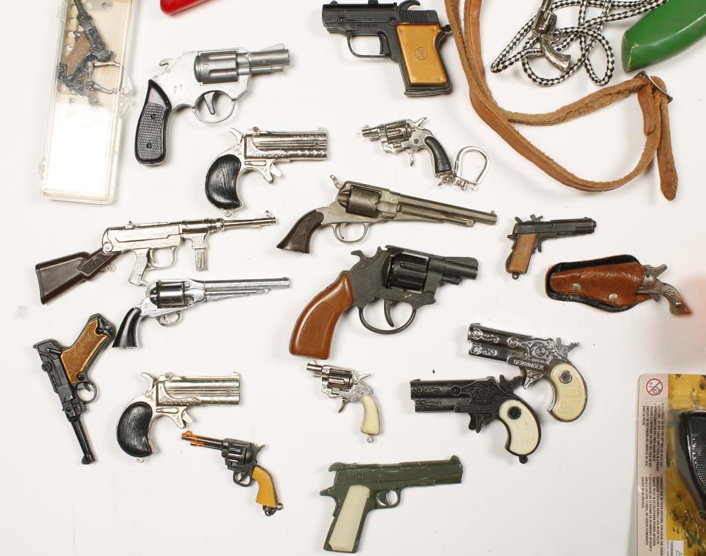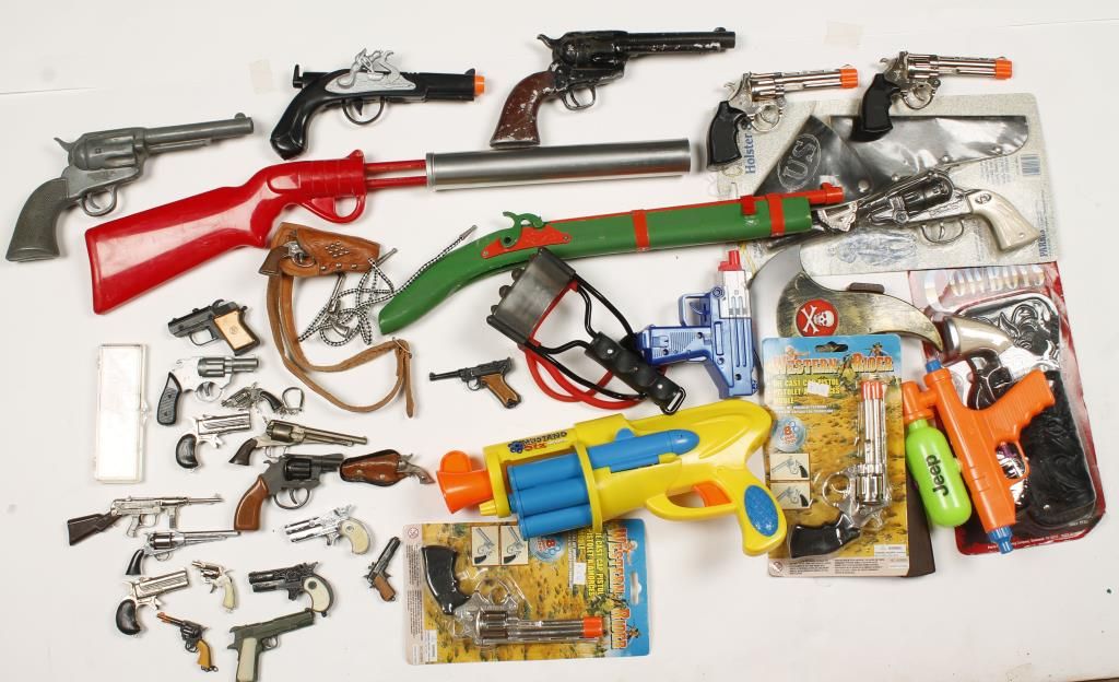 Includes a Wrist rocket type of slingshot (not a toy). Mostly toy guns. A few figures, a pirates axe, a small rocking horse, a few squirt guns, etc. Many toy holsters and guns. Most of the holsters are leather.