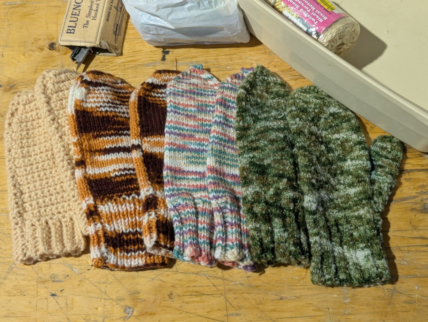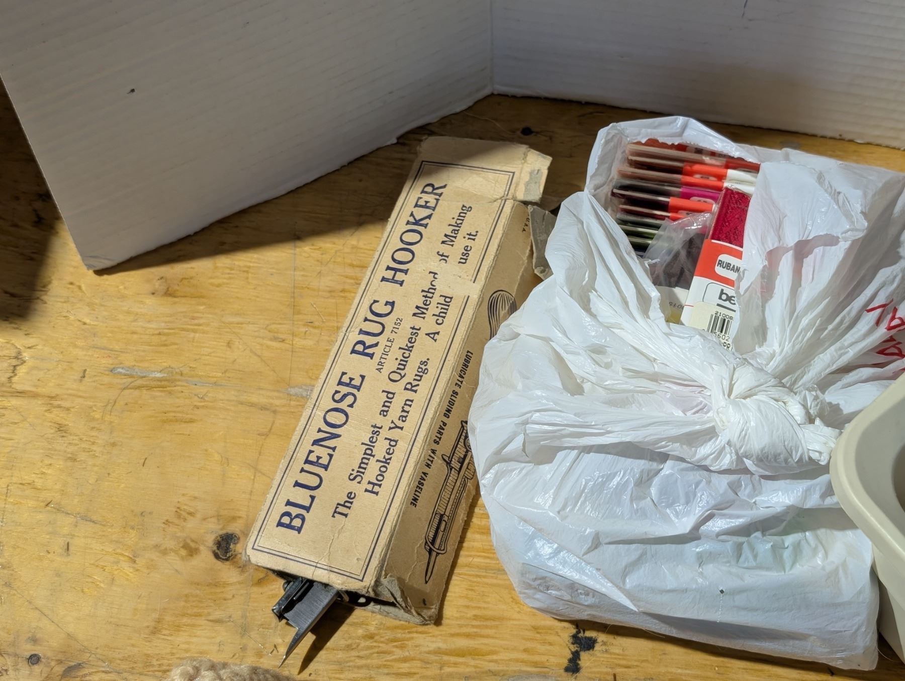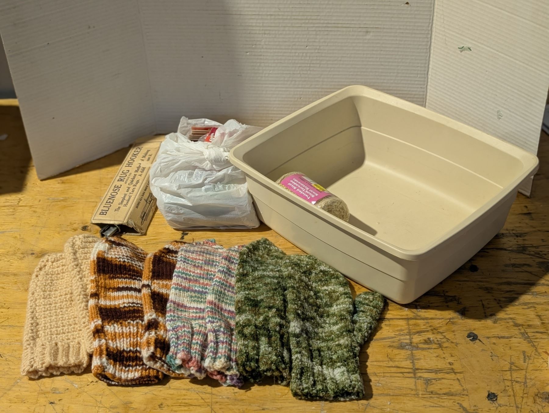 Plastic Box w/ (4) Pair of Handmade gloves, Sean Bindings, and vintage Nose Rug Puller