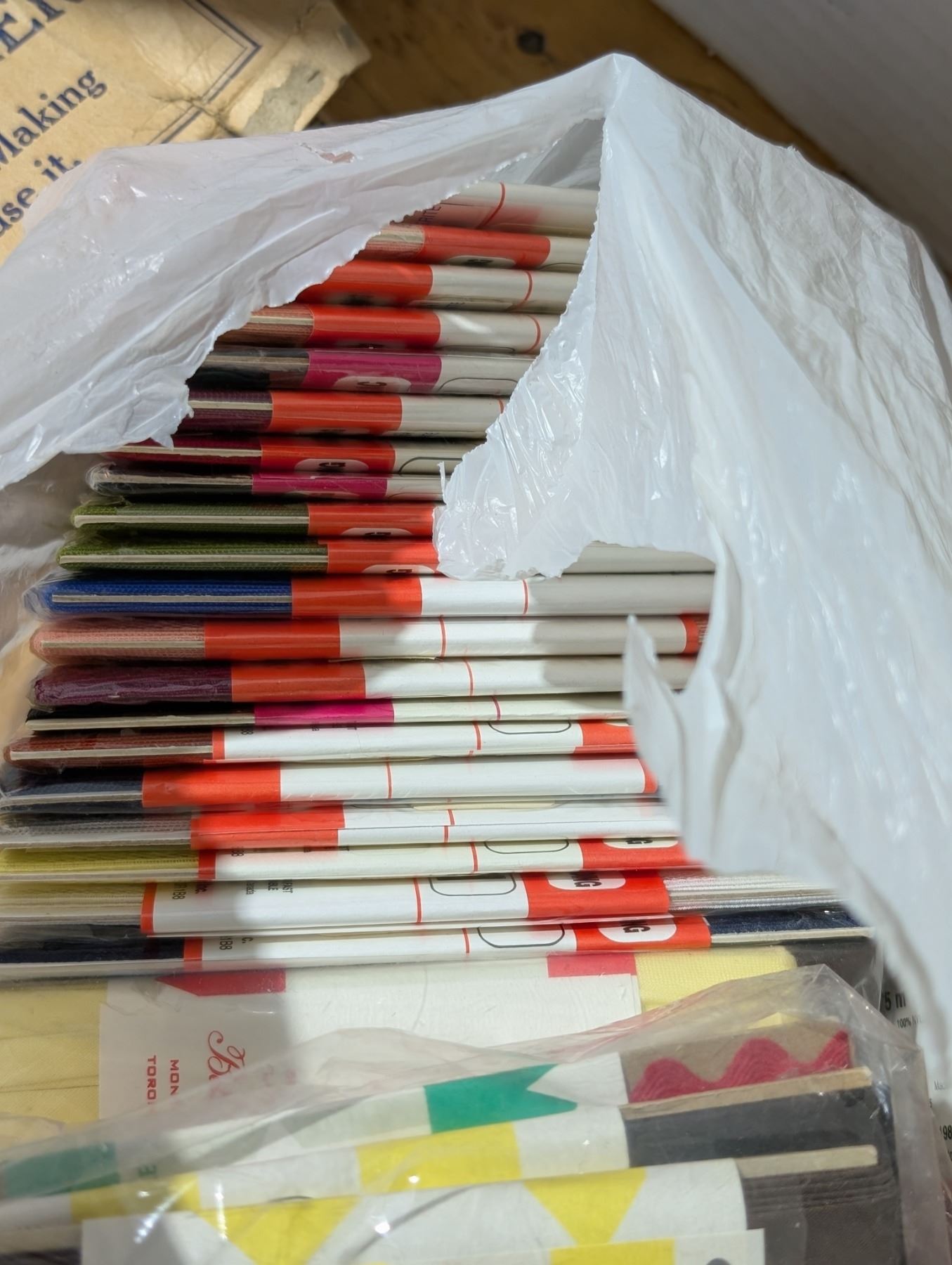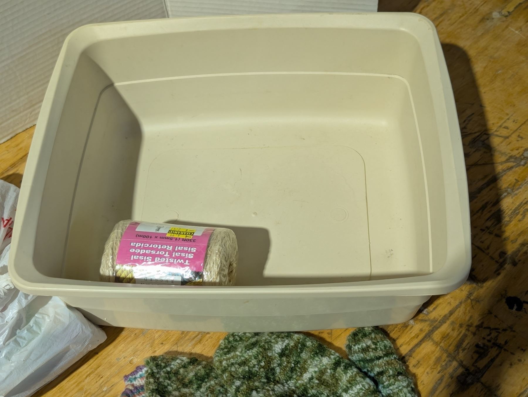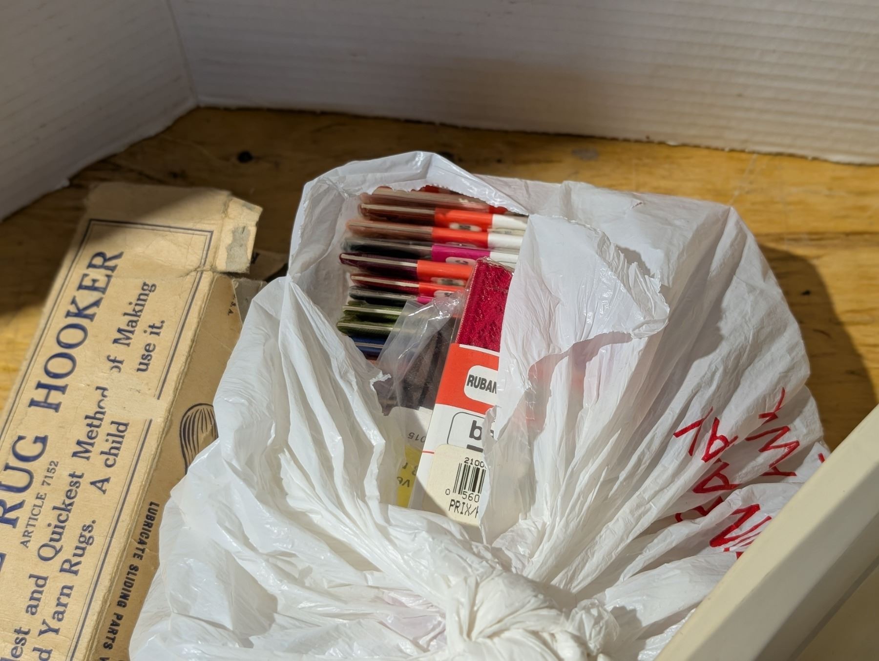 Plastic Box w/ (4) Pair of Handmade gloves, Sean Bindings, and vintage Nose Rug Puller
