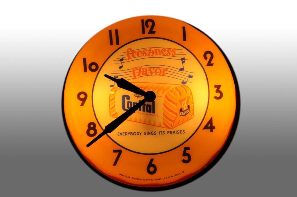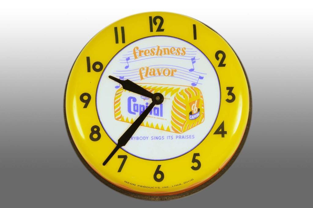 Made by Neon Products. Plastic formed face with metal band and back. Screened graphics with minor fading to loaf of bread. Mounting hole is elongated. Condition (9.0, Near Mint). Size 17" x 17".