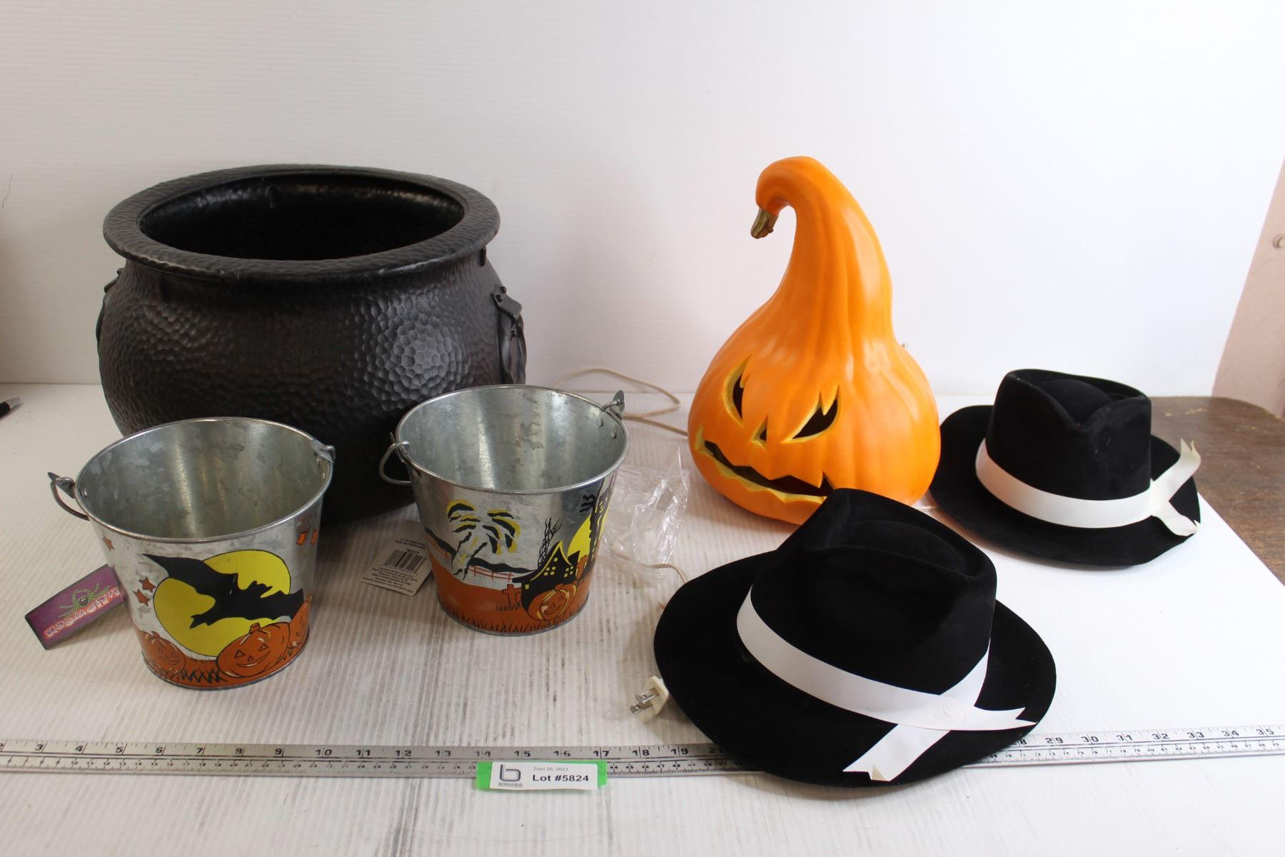 Plastic Cauldron, Light-Up Pumpkin - Works, (2) Halloween Pails, (2) Plastic Fedoras