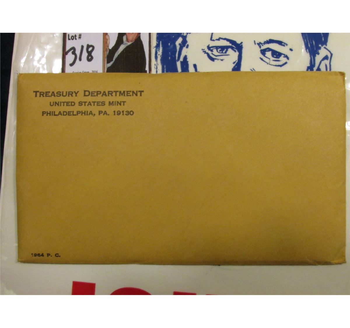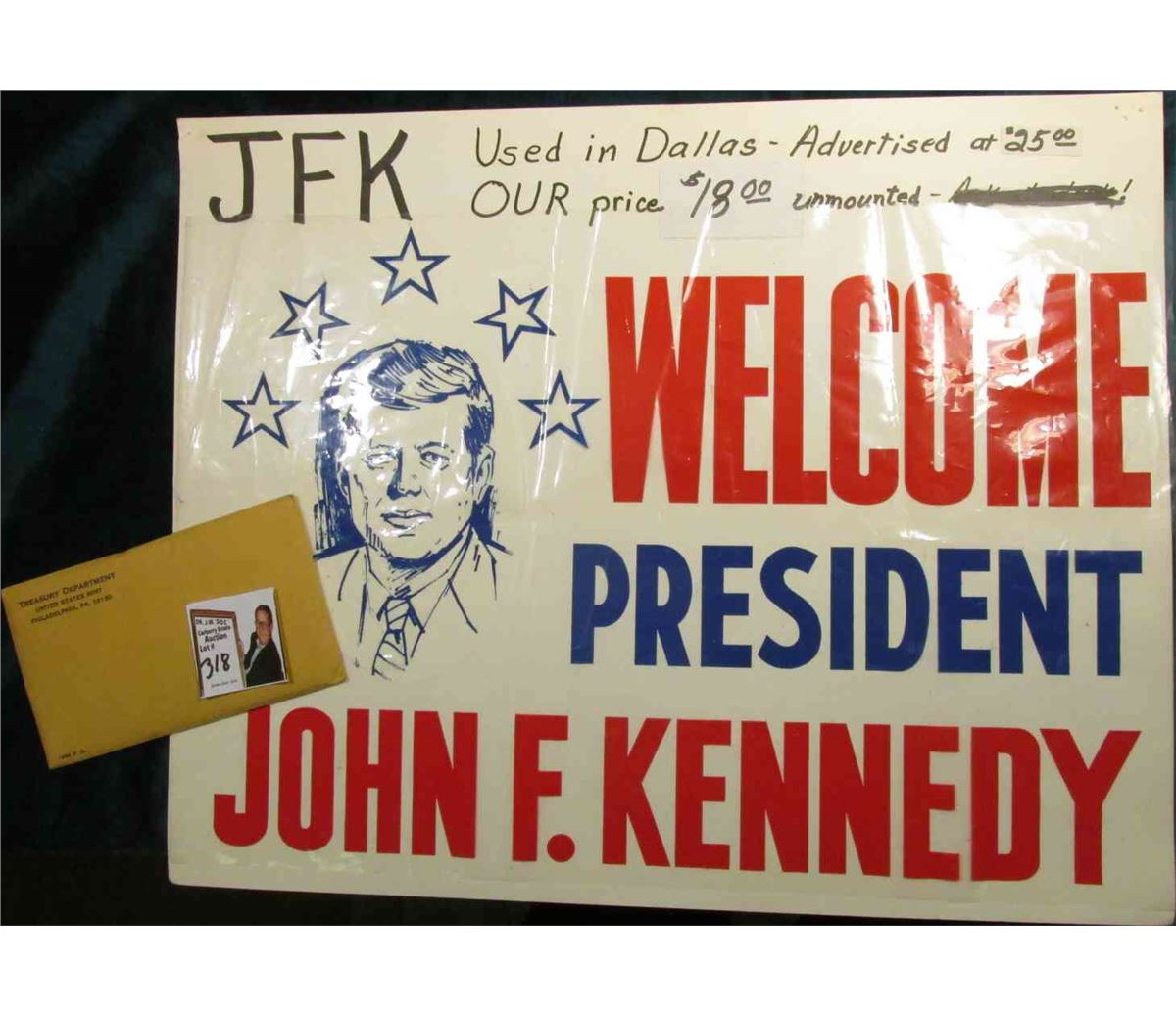 Plastic Cellophane Window sign Used in Dallas, Texas in 1963 "Welcome President John F. Kennedy"; & a Mint unopened 1964 U.S. Silver Proof Set in original envelope.