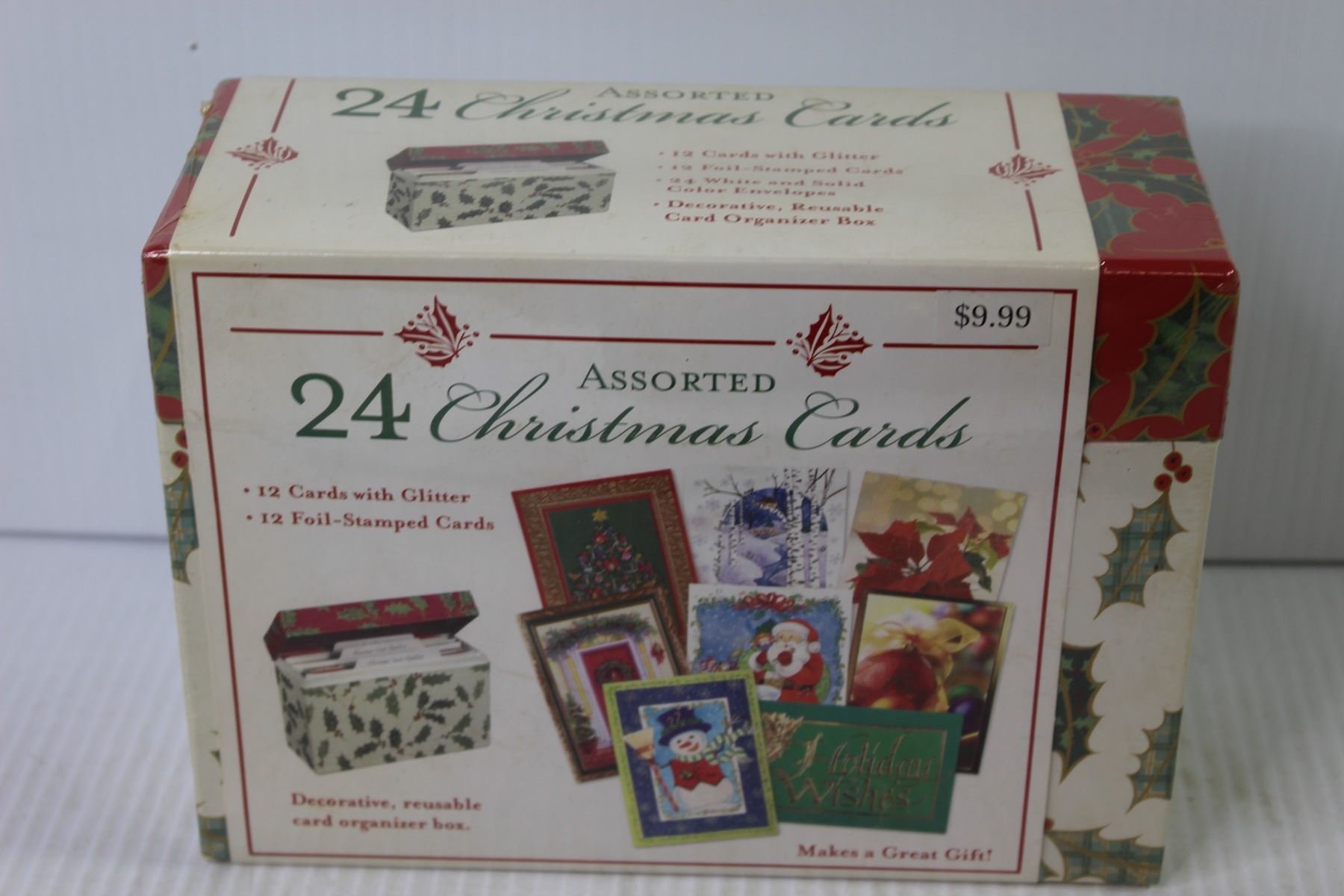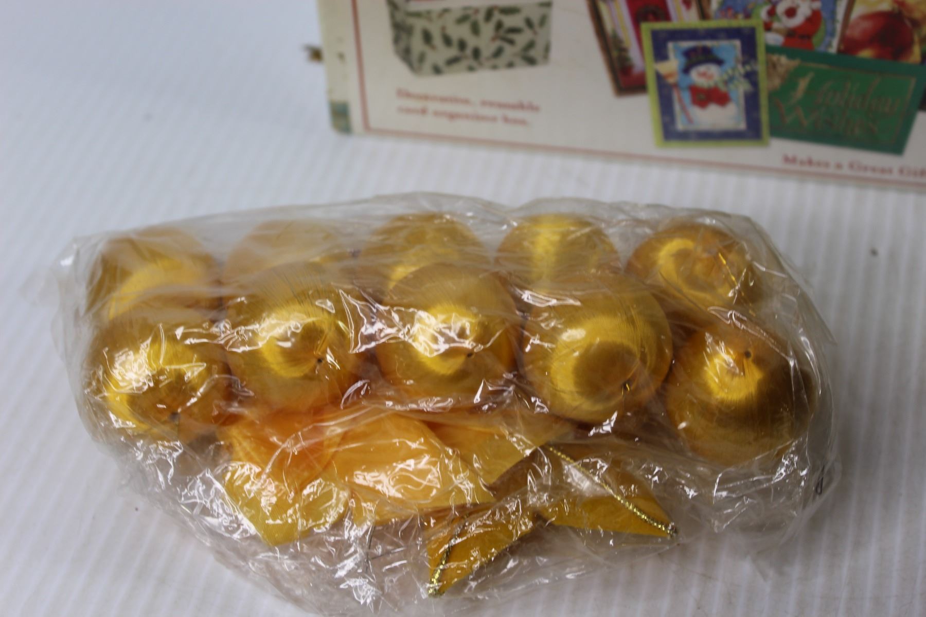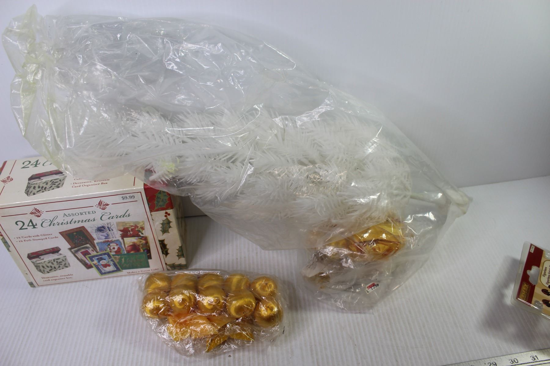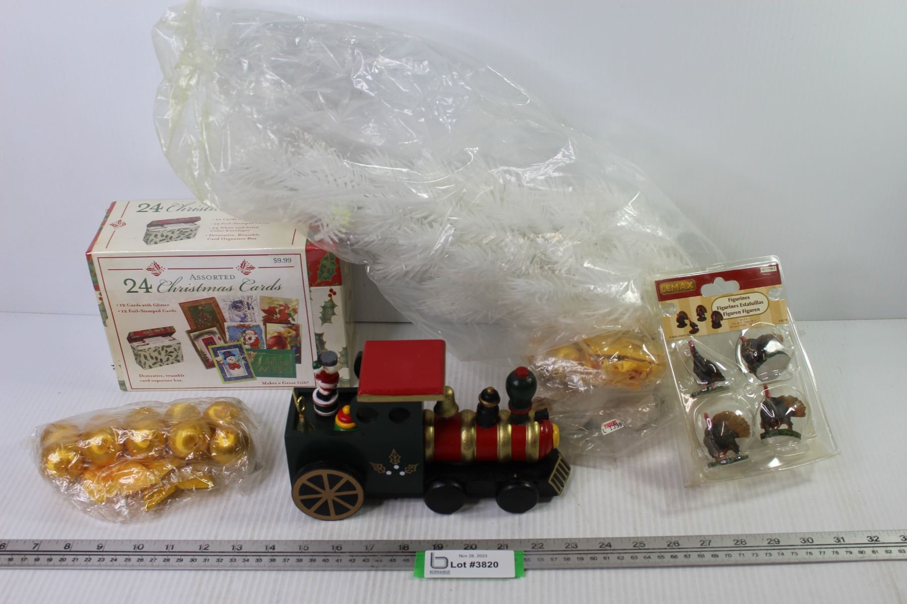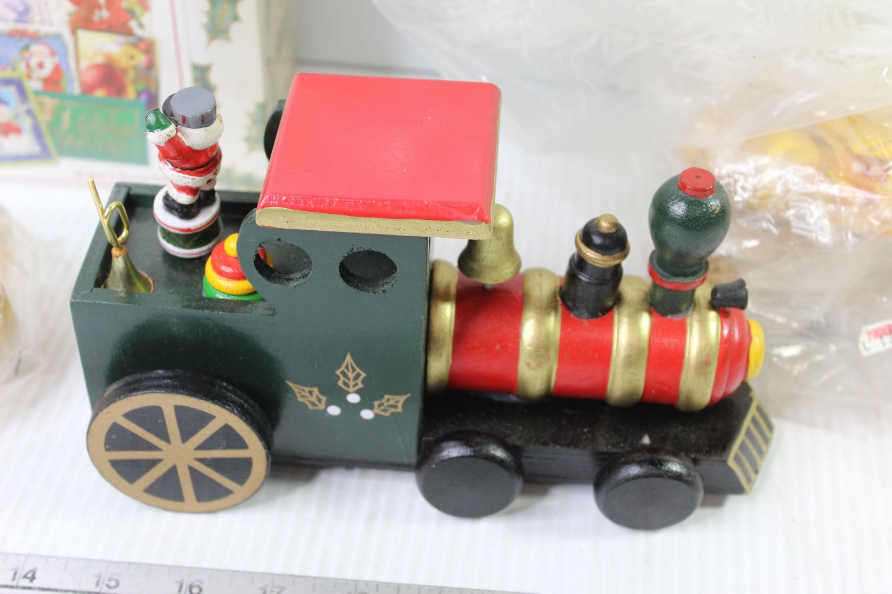 Plastic Christmas Tree - Decorations - Wooden Train - Box of Christmas Cards (unopened)