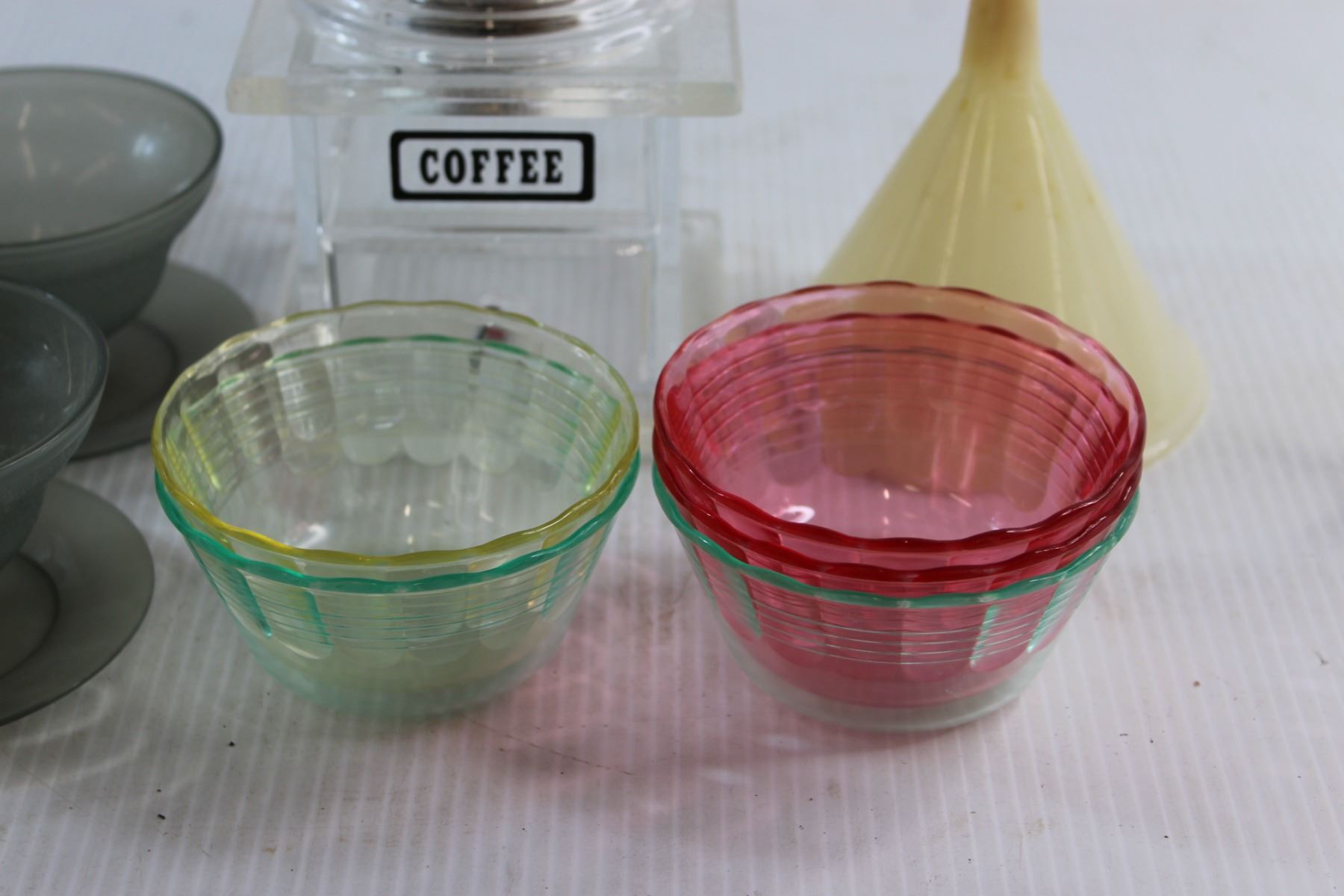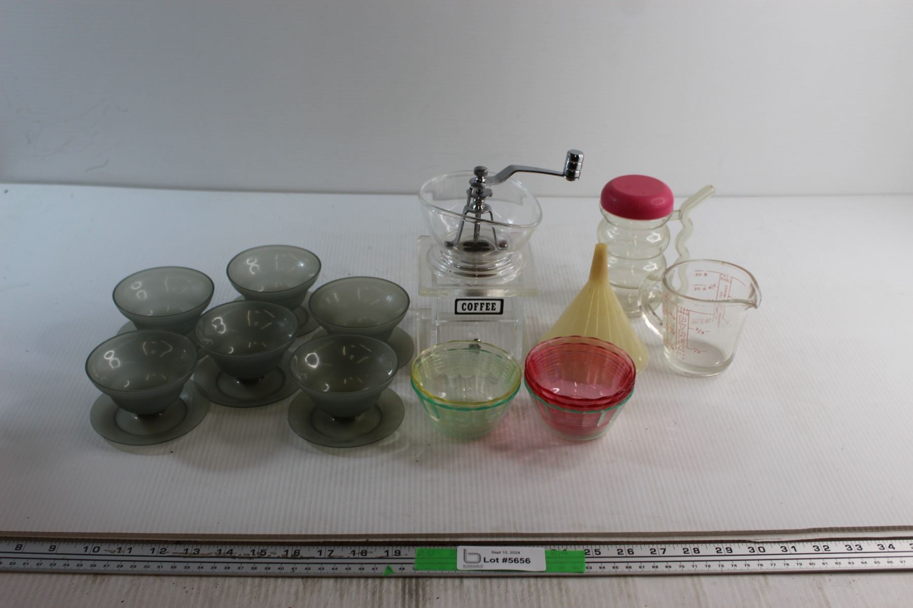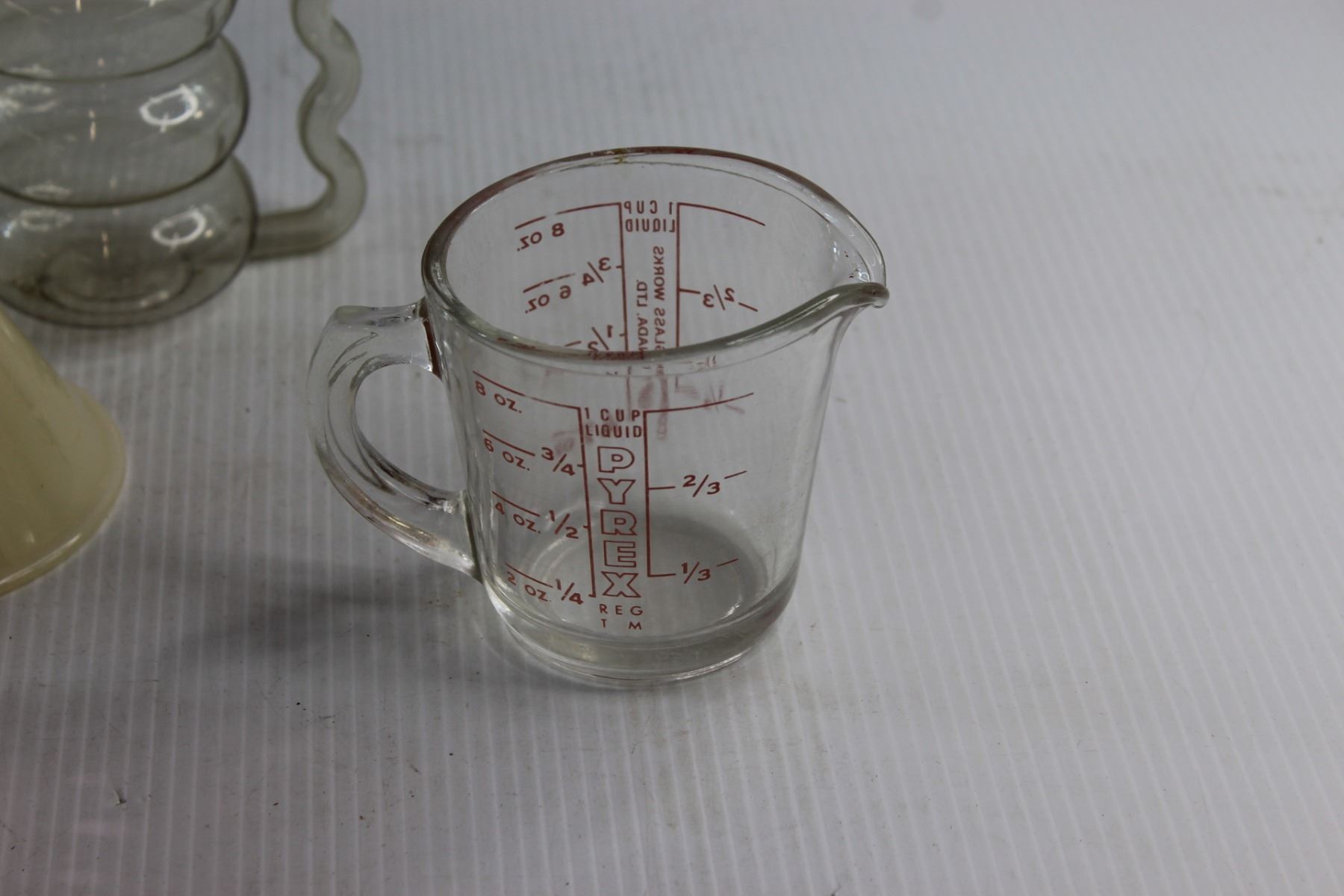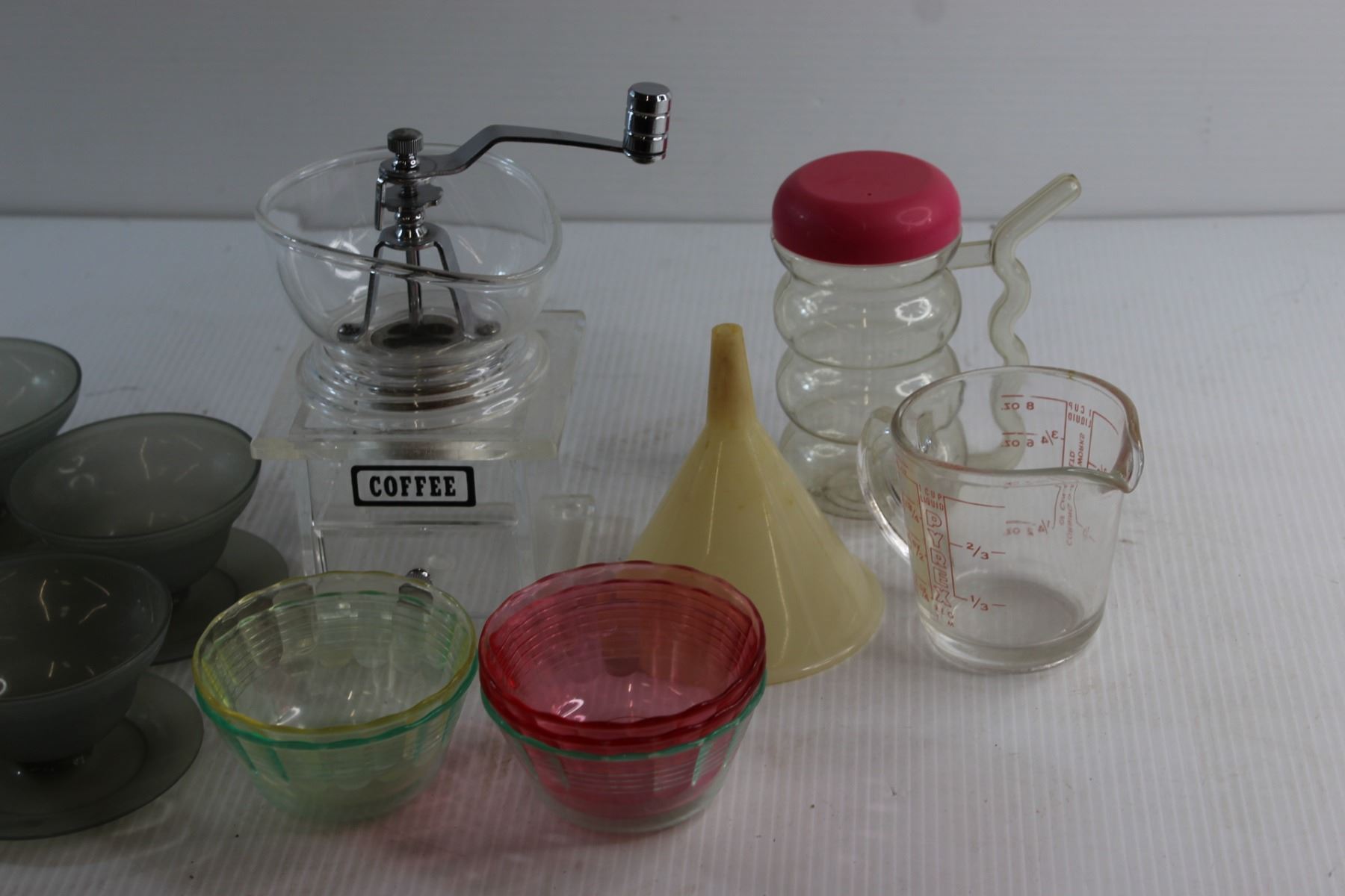 Plastic Coffee Grinder, Pyrex Measuring Pitcher, Funnel and Assorted Items
