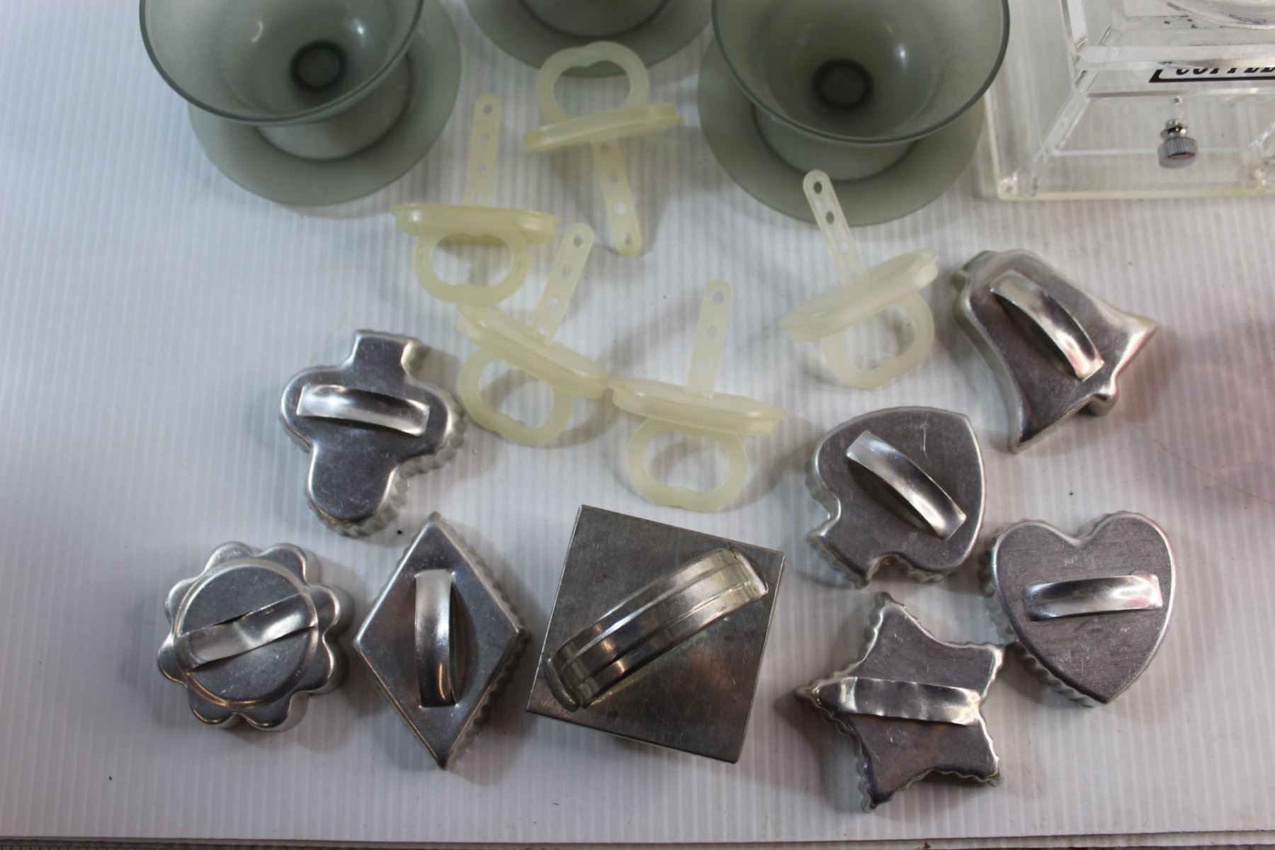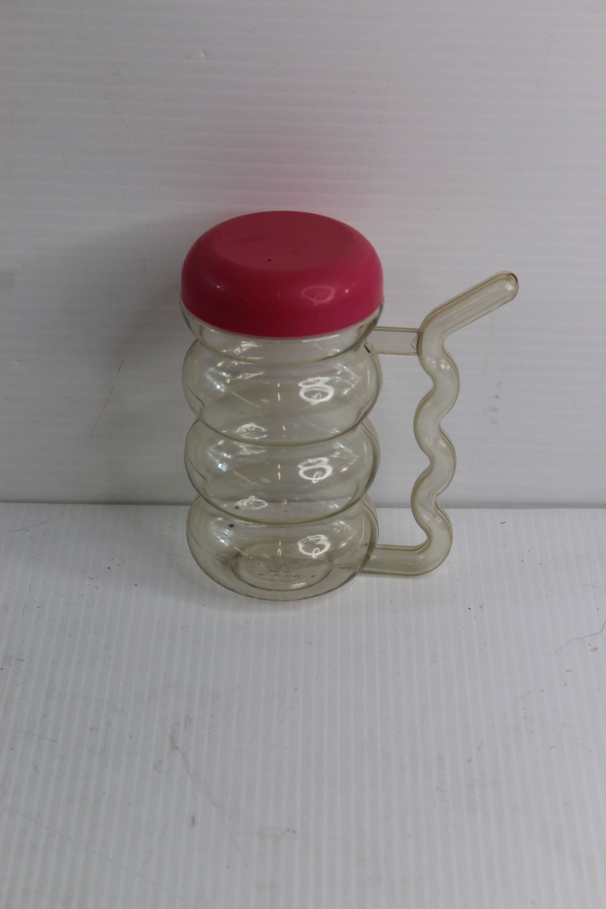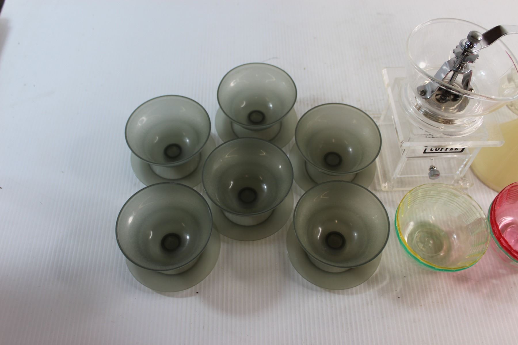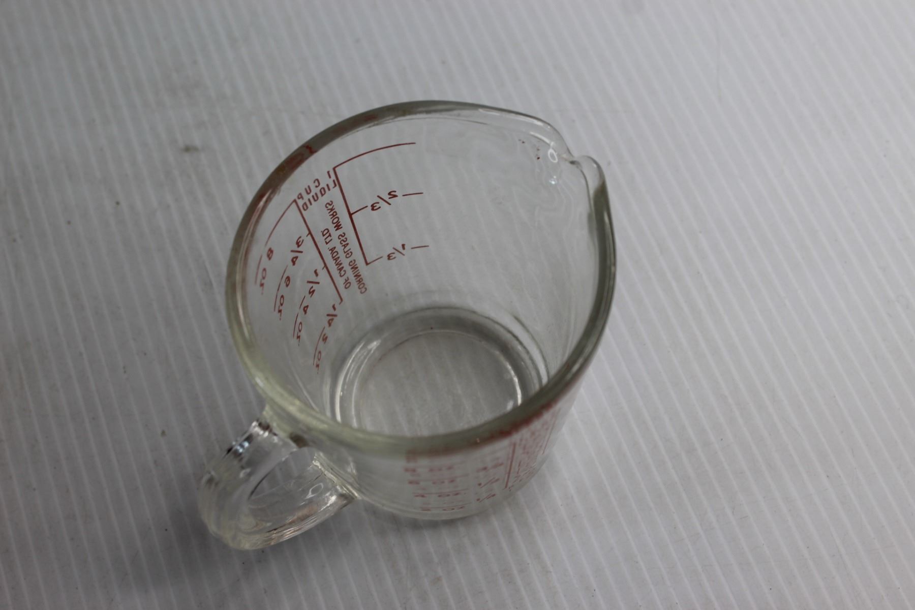 Plastic Coffee Grinder, Pyrex Measuring Pitcher, Funnel and Assorted Items