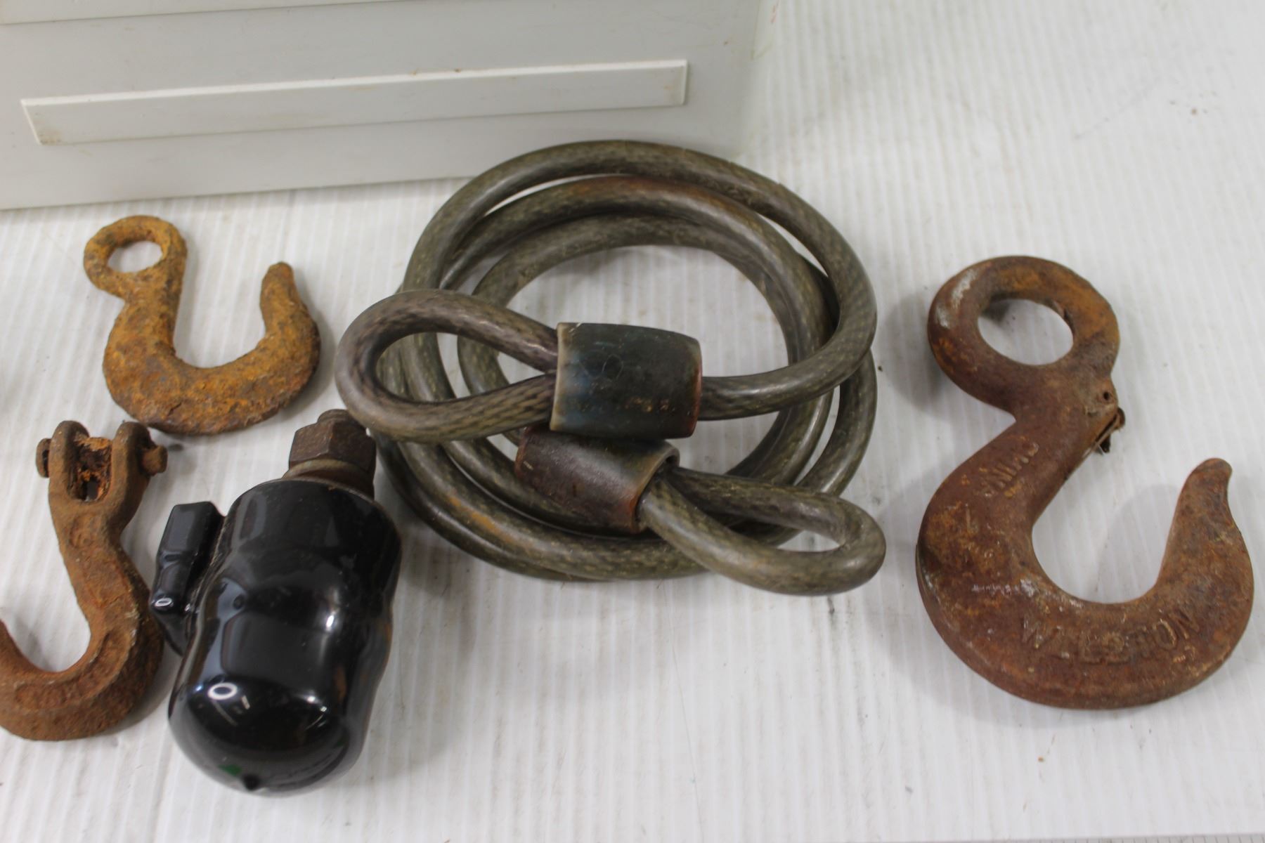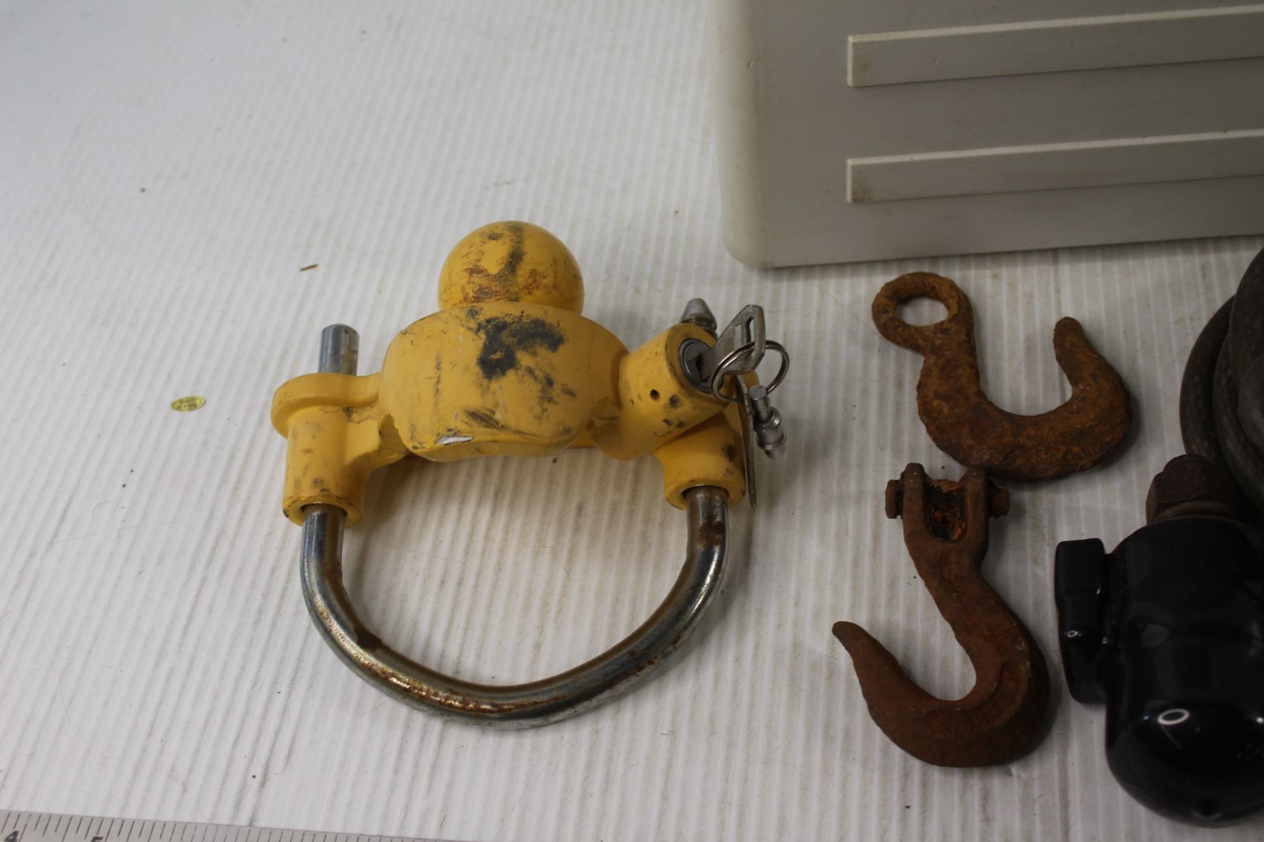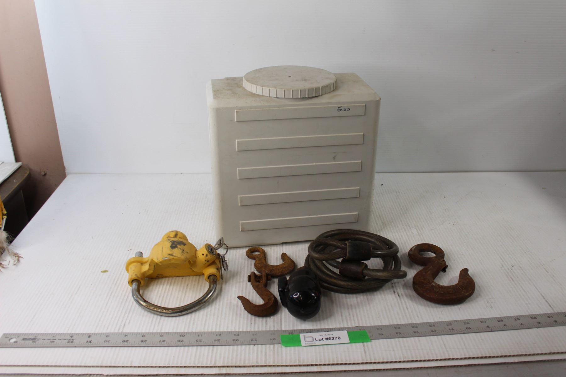 Plastic Container With Lid, (3) Hooks, Bike Lock, Lock