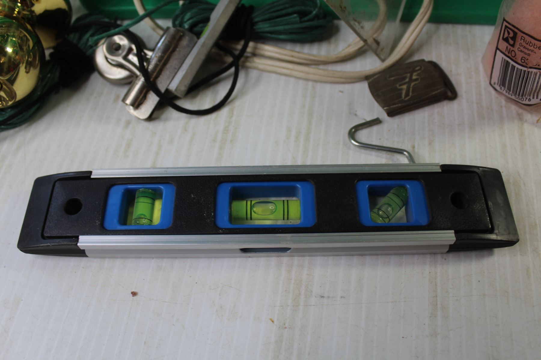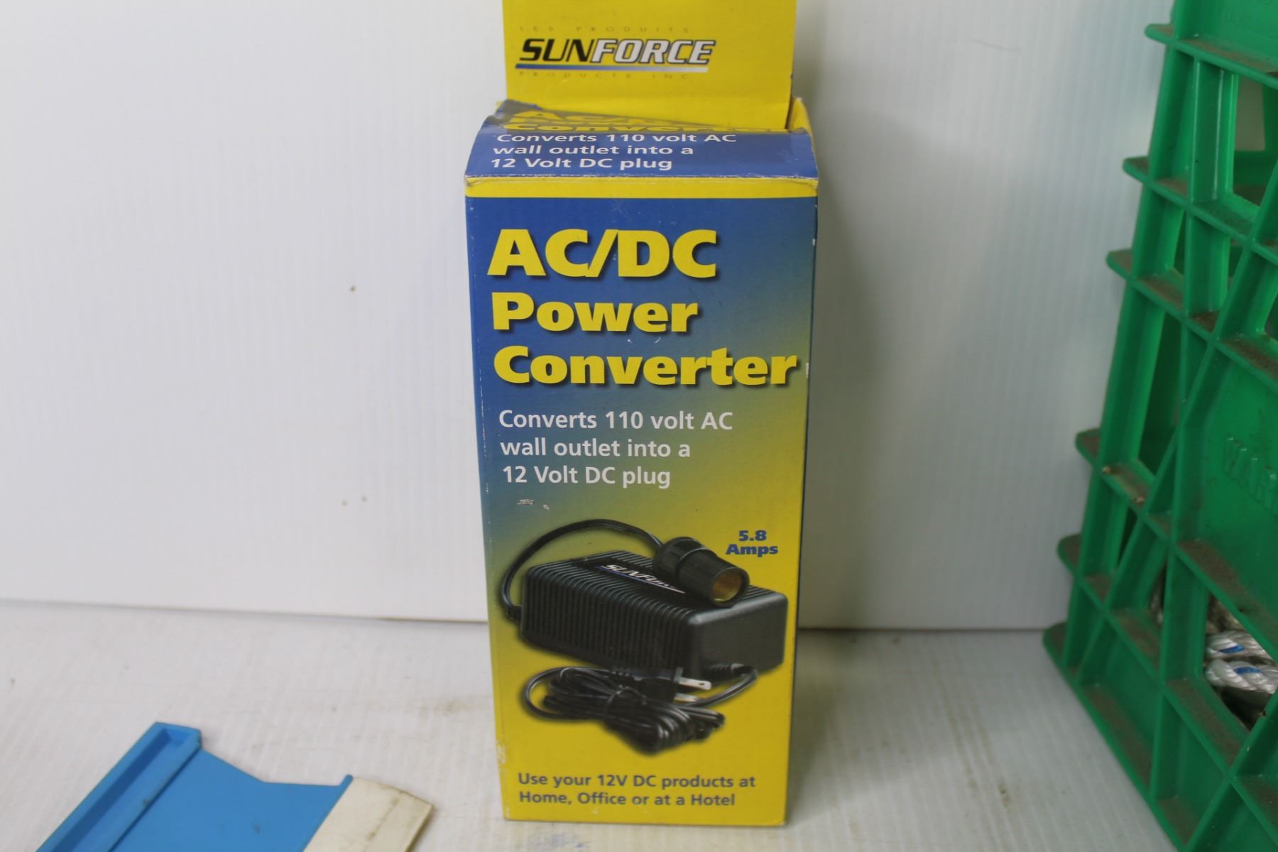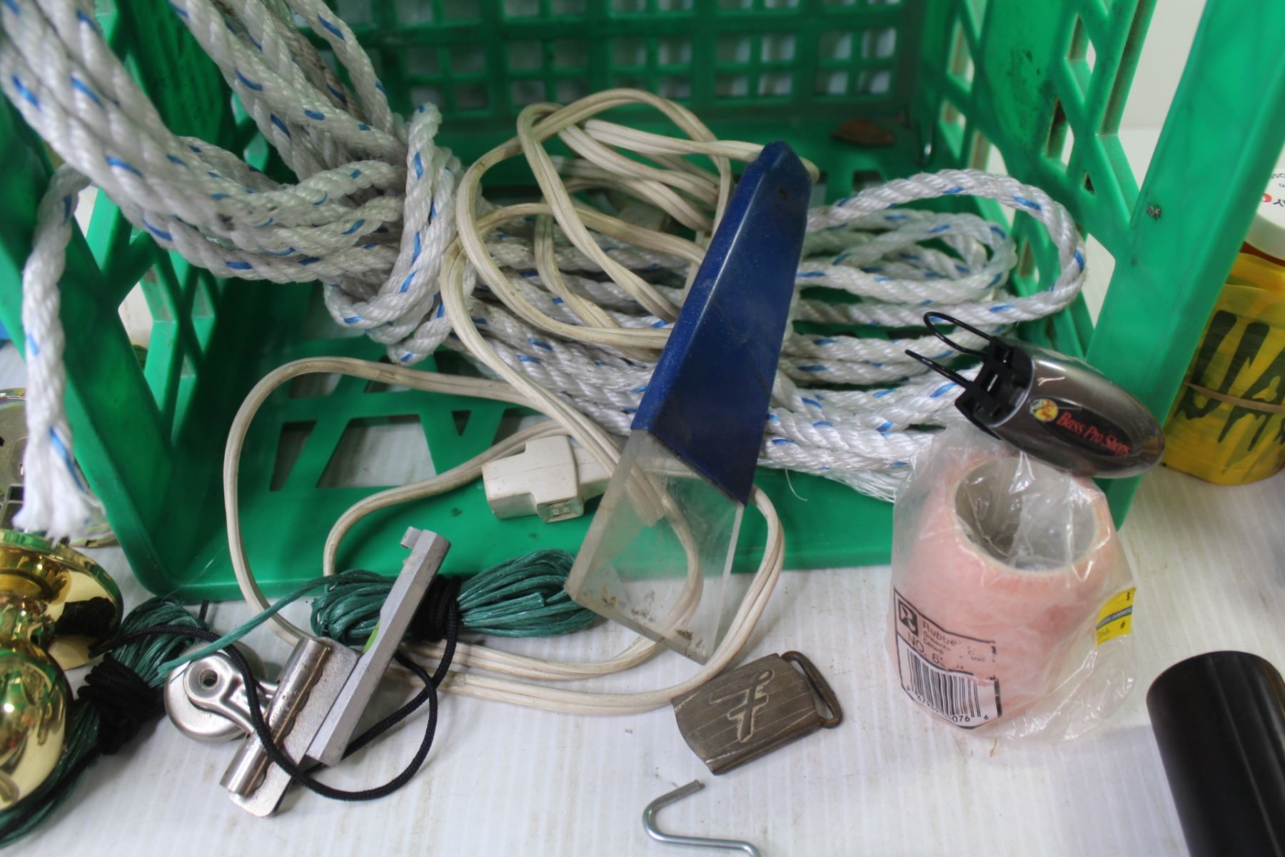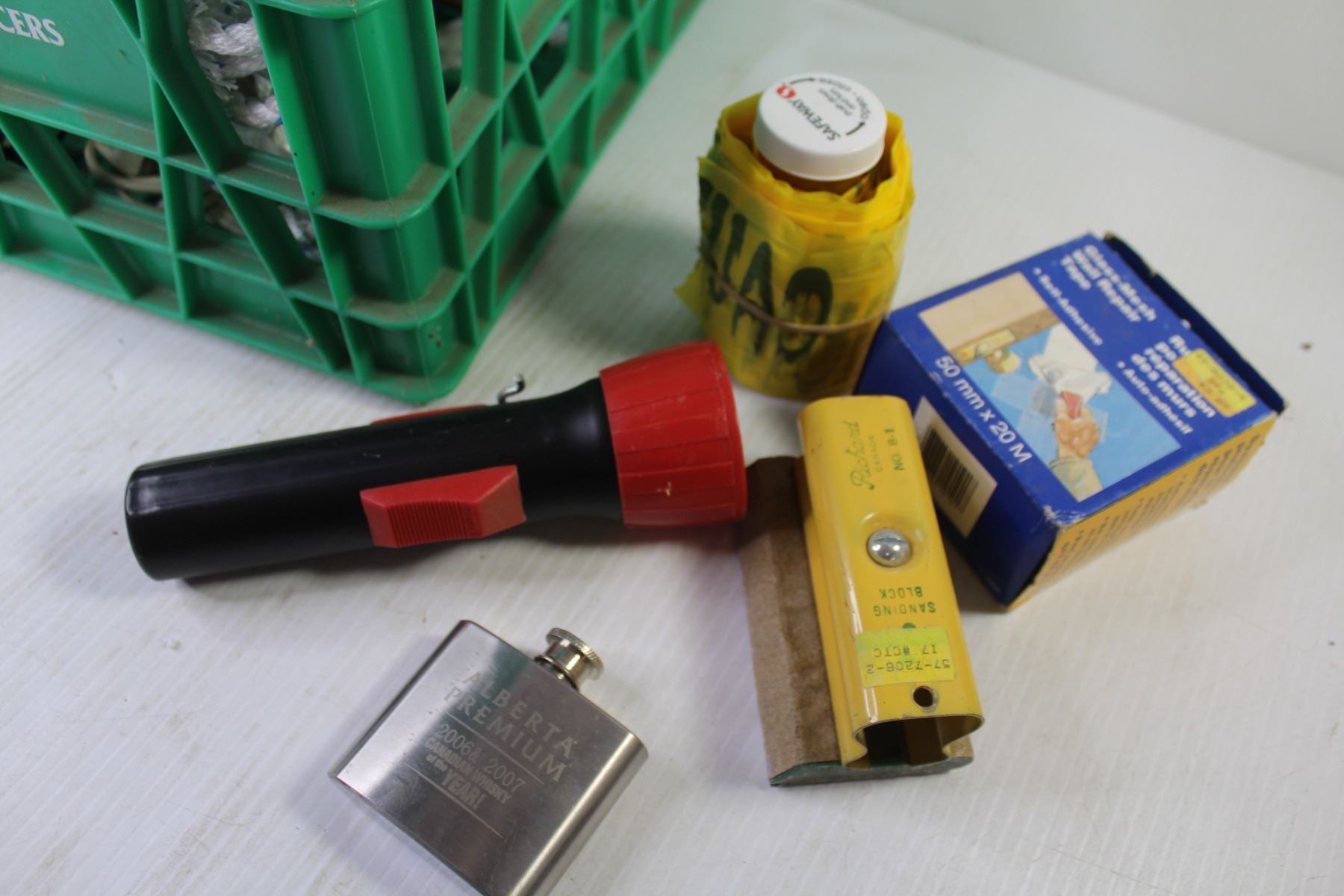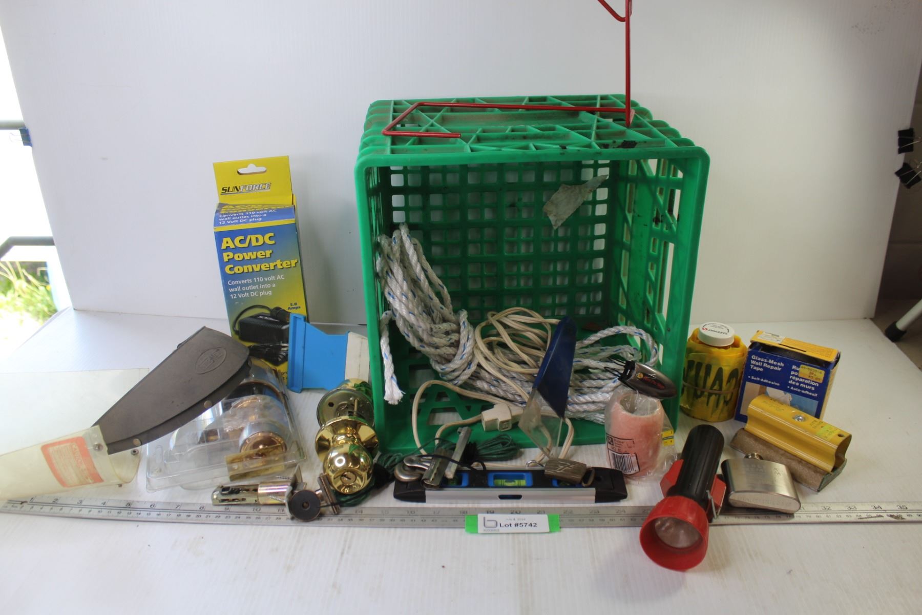Plastic Crate - Level - Flashlight - AD-DC Power Converter - Rope - Flask - Misc. Items