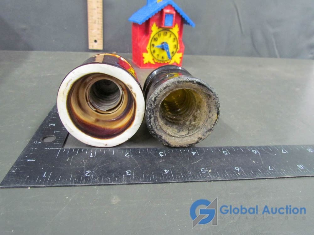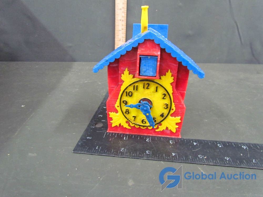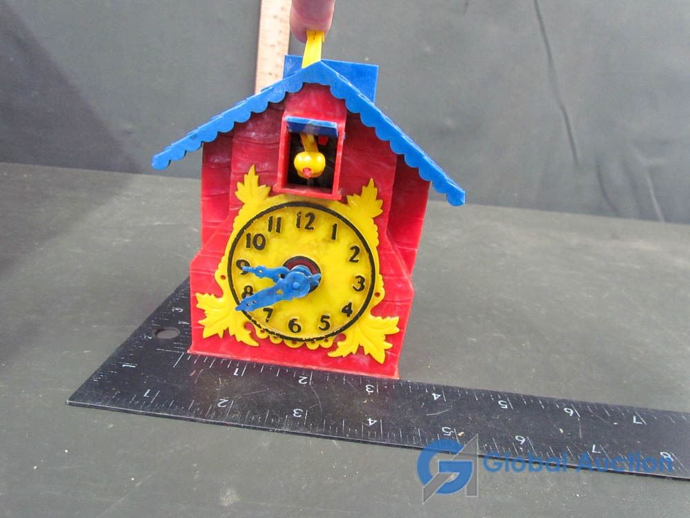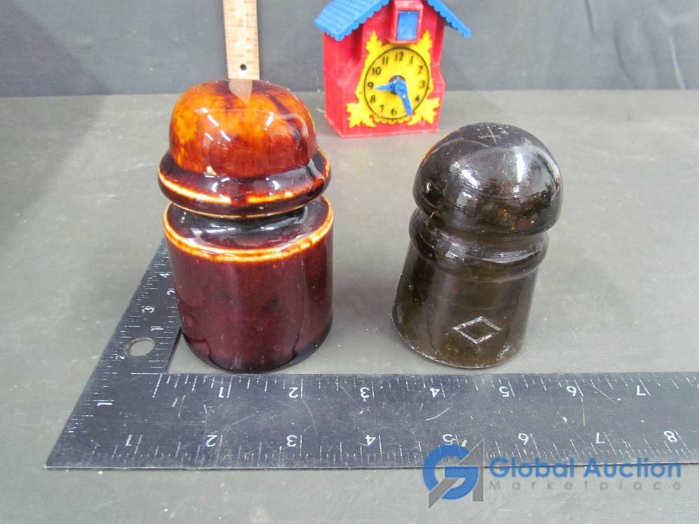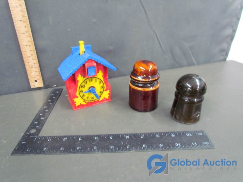 Plastic Cuckoo Clock Bank (dated 1950) and (2) Glass Insulators