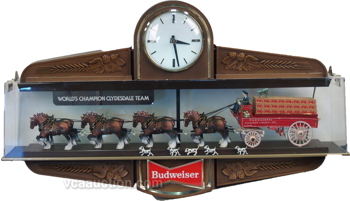 Plastic Hanging Budweiser Beer Light-Up Sign & Clock w/ World's Champion Clydesdale Team & Wagon, works - 34" x 20"