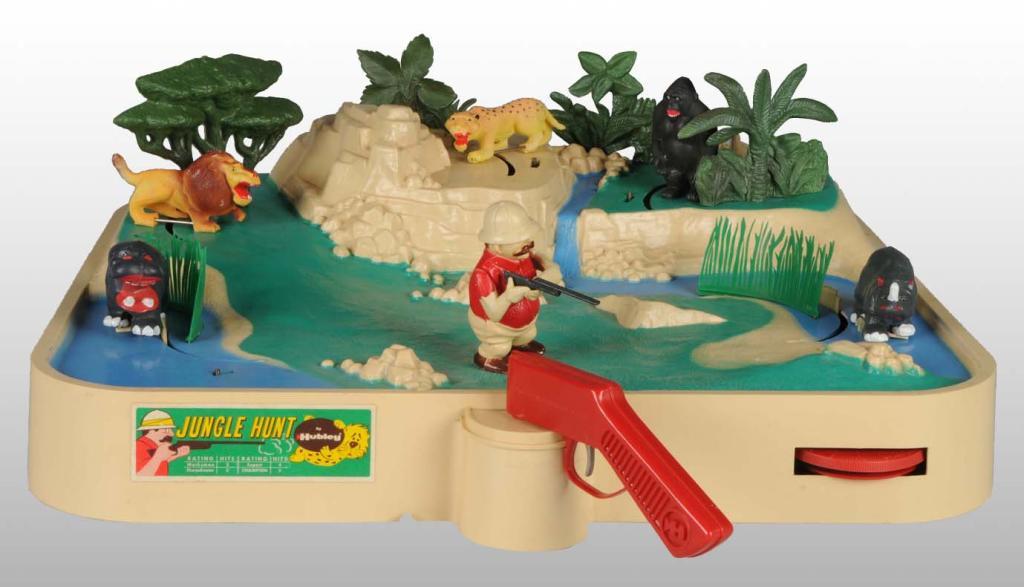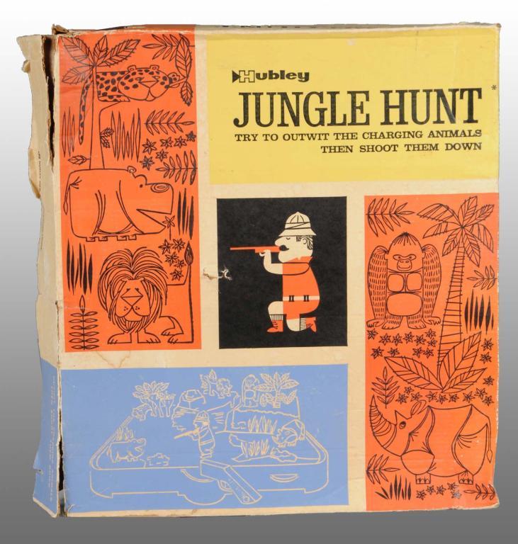 Description Circa 1950s. Includes hunter, hippopotamus, rhinoceros, gorilla, lion, and leopard along with assorted trees and shrubs. Hunter is pointed with plastic gun and shoots charging animals. One crack in the back of playing field that continues through the back of base. Includes original and complete box with some tears and creasing. Condition (Good - Very Good). Size 24" x 18".