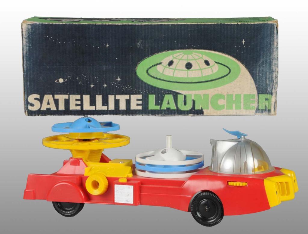 Description Wheels are marked "Ideal Toy Company".  Includes original satellite launchers and  launching discs. No cracks to plastic dome.  Includes original box marked "# 4874". Condition (Near Mint). Size 16" L.