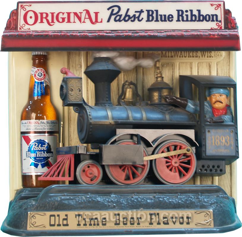 Plastic Light-Up Motion Pabst Blue Ribbon Beer Sign; old locomotive w/ engineer