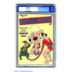Plastic Man #3 (Quality, 1946) CGC VF/NM 9.0 Off-white pages. This early Plastic Man has a typically funny, well-drawn cover and interior art by the great Jack Cole. This beautiful comic is sharp, flat, and bright with only minor handling wear keeping it from an even higher grade. Overstreet 2002 NM 9.4 value = $1,175. Important notice: We expect to be auctioning lots at the rate of 200-250 per hour. Sometimes eBay Premier live bid software cannot keep up with that pace, so we strongly recommend that you place a realistic proxy bid now as insurance to avoid disappointment. Also please note that all Heritage/CAA lots purchased through eBay Premier carry a 20% Buyer's Premium. Please make sure you read the Terms and Conditions.