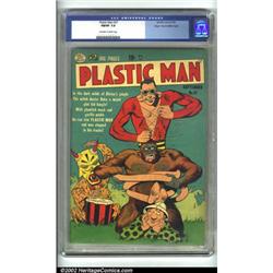 Plastic Man #31 Mile High pedigree (Quality, 1951) CGC FN/VF 7.0 Off-white to white pages. Plastic Man is one of those strange characters born out of the Golden Age. This issue has a cool gorilla cover, and comes from the famed basement of Edgar Church. The only wear bringing the grade down is on the extreme edges and does not really detract from the overall beauty of this book. Overstreet 2002 FN 6.0 value = $111; VF 8.0 value = $257. Important notice: We expect to be auctioning lots at the rate of 200-250 per hour. Sometimes eBay Premier live bid software cannot keep up with that pace, so we strongly recommend that you place a realistic proxy bid now as insurance to avoid disappointment. Also please note that all Heritage/CAA lots purchased through eBay Premier carry a 20% Buyer's Premium.