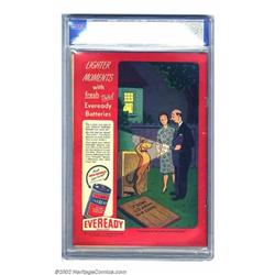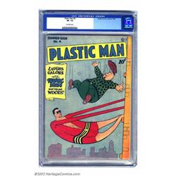 Plastic Man #4 (Quality, 1946) CGC VF- 7.5 Off-white pages. Plas comes to the rescue of the ever hapless Woozy on this classic Jack Cole cover. A Gerber 6 with only 50-200 copies estimated to exist, this is one of the scarcer issues of Plastic Man. This clean, flat, and bright copy is sure to please fans. Overstreet 2002 VF 8.0 value = $525. Important notice: We expect to be auctioning lots at the rate of 200-250 per hour. Sometimes eBay Premier live bid software cannot keep up with that pace, so we strongly recommend that you place a realistic proxy bid now as insurance to avoid disappointment. Also please note that all Heritage/CAA lots purchased through eBay Premier carry a 20% Buyer's Premium. Please make sure you read the Terms and Conditions.