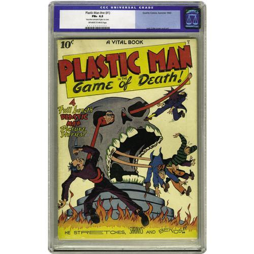 <B>Plastic Man #nn (#1) (Quality, 1943) CGC FN+ 6.5 Off-white to white pages.</B></I> Jack Cole's remarkable creation, Plastic Man, was unique, even during the Golden Age of superheroes. First was the fact that this costumed crime fighter was, in the beginning, a criminal himself. Second was the wacky sense of humor that Cole infused into his stories. Not even Captain Marvel's lighter brand of stories could match the way Cole could bring a smile to kids' faces every time they turned a page. And these weren't all fun and games tales -- in a Cole story, the bullets flew fast and thick! This very clean, flat copy appears at first glance to be undergraded, but CGC does note: "Small amount of glue on cover." Overstreet 2006 FN 6.0 value = $1,257; VF 8.0 value = $2,724. CGC census 3/06: 2 in 6.5, 5 higher.