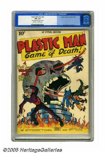 <B>Plastic Man #nn (#1) (Quality, 1943) CGC FN+ 6.5 Off-white to white pages.</B></I> Jack Cole's remarkable creation, Plastic Man, was unique, even during the Golden Age of superheroes. First was the fact that this costumed crime fighter was, in the beginning, a criminal himself. Second was the wacky sense of humor that Cole infused into his stories. Not even Captain Marvel's lighter brand of stories could match the way Cole could bring a smile ti kids' faces every time they turned a page. And these weren't all fun and games tales -- in a Cole story, the bullets flew fast and thick! This very clean, flat copy appears at first glance to be undergraded, but CGC does note: "Small amount of glue on cover." Overstreet 2005 FN 6.0 value = $1,242; VF 8.0 value = $2,691. CGC census 6/05: 2 in 6.5, 3 higher.