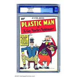 Plastic Man #nn (#2) (Quality, 1944) CGC FN/VF 7.0 Off-white to white pages. Jack Cole provides the cover and art to "The Gay Nineties Nightmare!" a perennial favorite for fans of ol' Plas. This comic's sharp corners, bright colors, and pure white cover background, give it the appearance of a higher grade. The spine has a few stress lines, but this book has no major defects; CGC was tough on this one! Overstreet 2002 FN 6.0 value = $505; VF 8.0 value = $1,050. Important notice: We expect to be auctioning lots at the rate of 200-250 per hour. Sometimes eBay Premier live bid software cannot keep up with that pace, so we strongly recommend that you place a realistic proxy bid now as insurance to avoid disappointment. Also please note that all Heritage/CAA lots purchased through eBay Premier carry a 20% Buyer's Premium. Please make sure you read the Terms and Conditions.