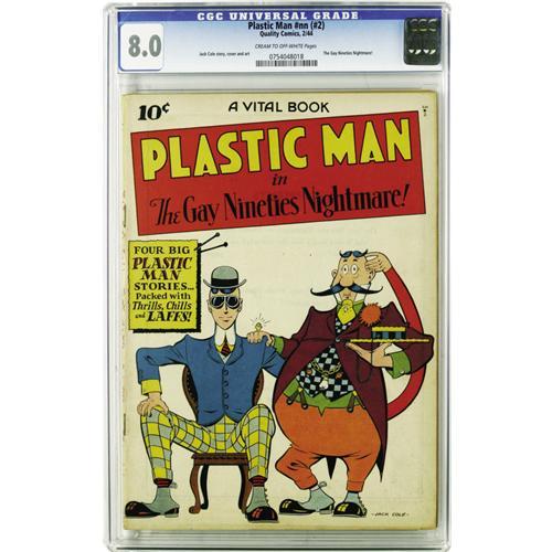 <B>Plastic Man #nn (#2) (Quality, 1944) CGC VF 8.0 Cream to off-white pages.</B></I> Only the Mile High and Crowley copies have been graded higher than this copy to date! Plastic Man's creator Jack Cole drew Plas and Woozy Winks getting into the turn-of-the-century spirit on the cover, and Cole provided the interior story and art as well. Overstreet 2006 VF 8.0 value = $1,181. CGC census 2/06: 1 in 8.0, 2 higher. <I>From the Collection of Harold Curtis.</B></I>