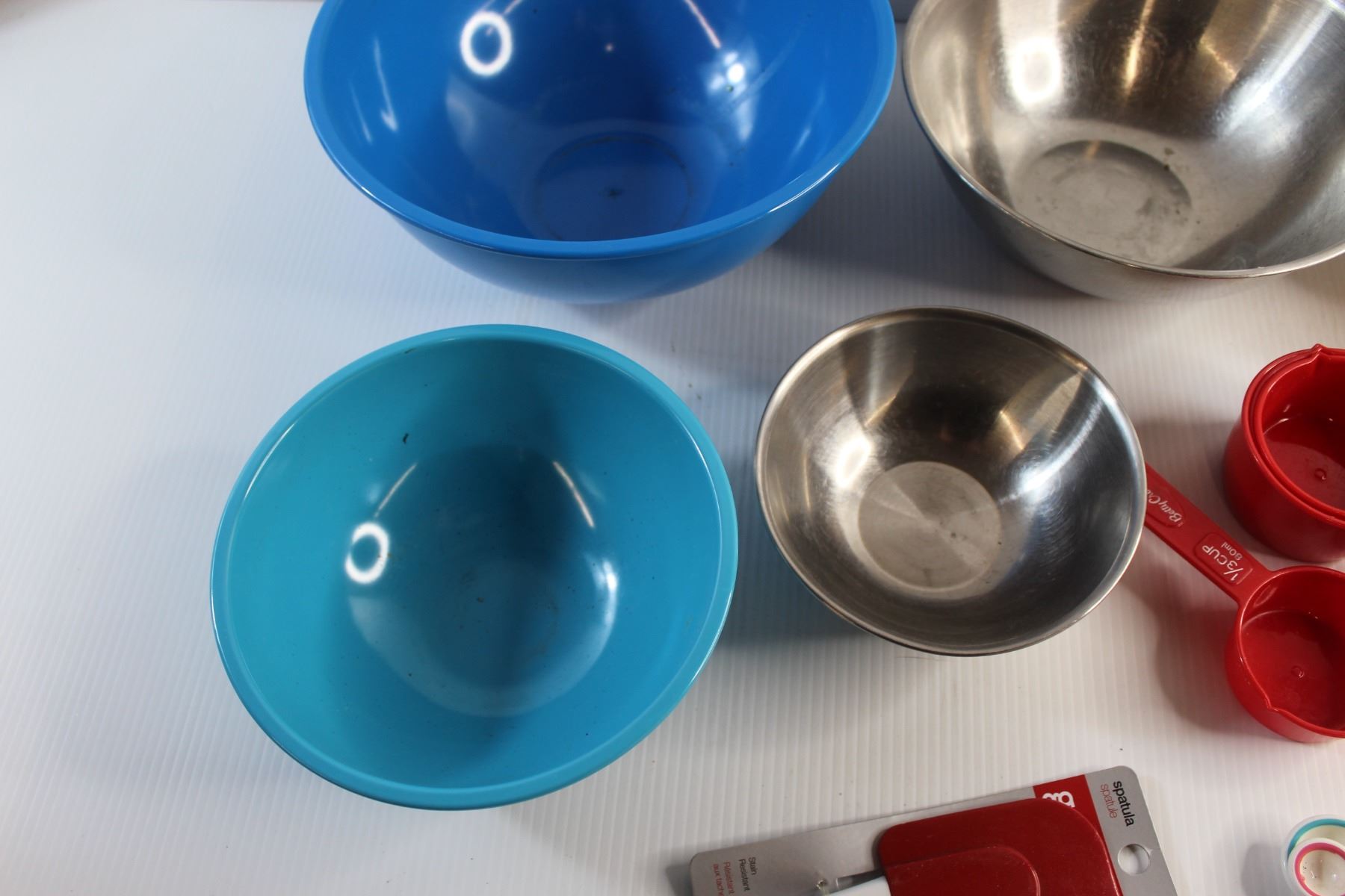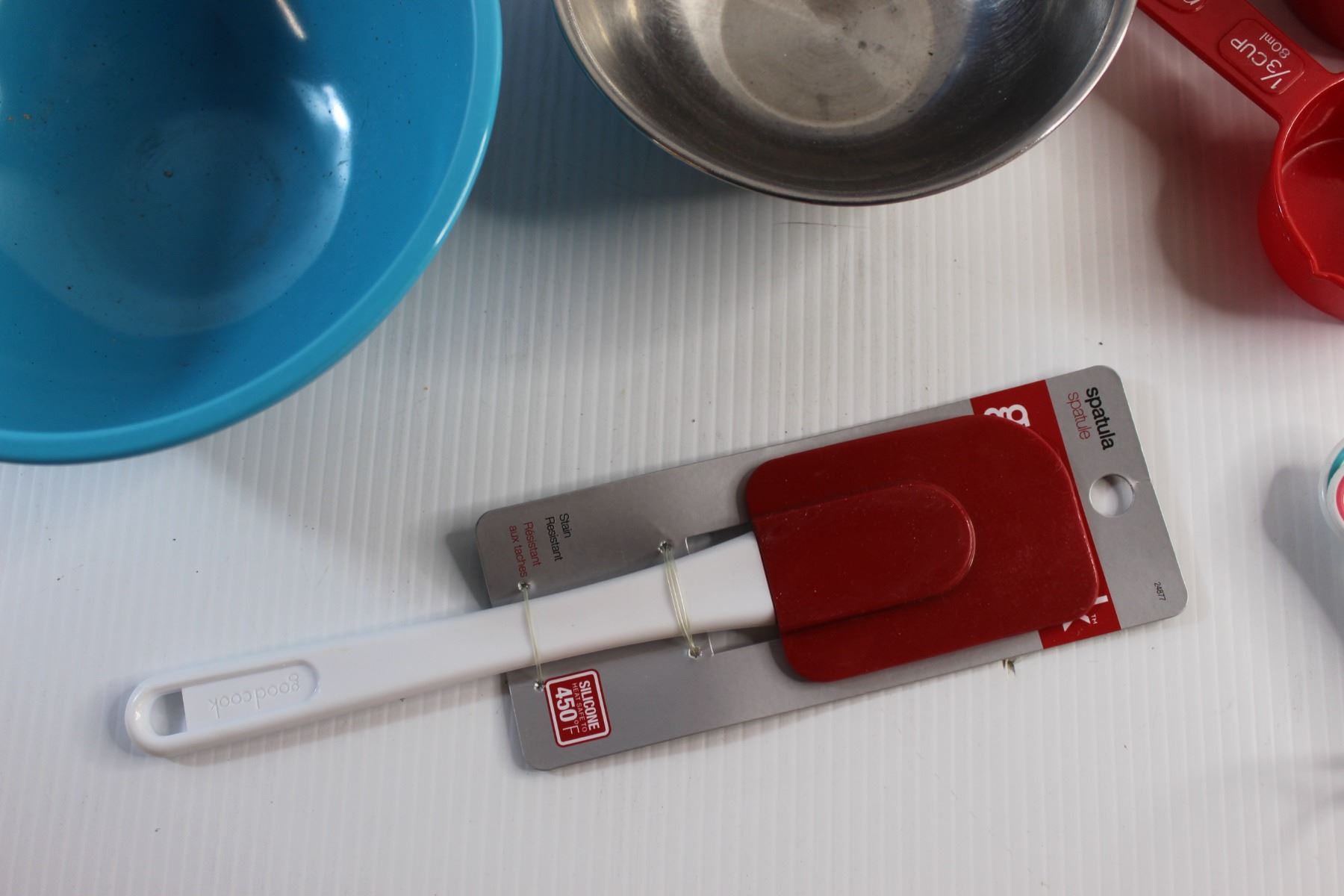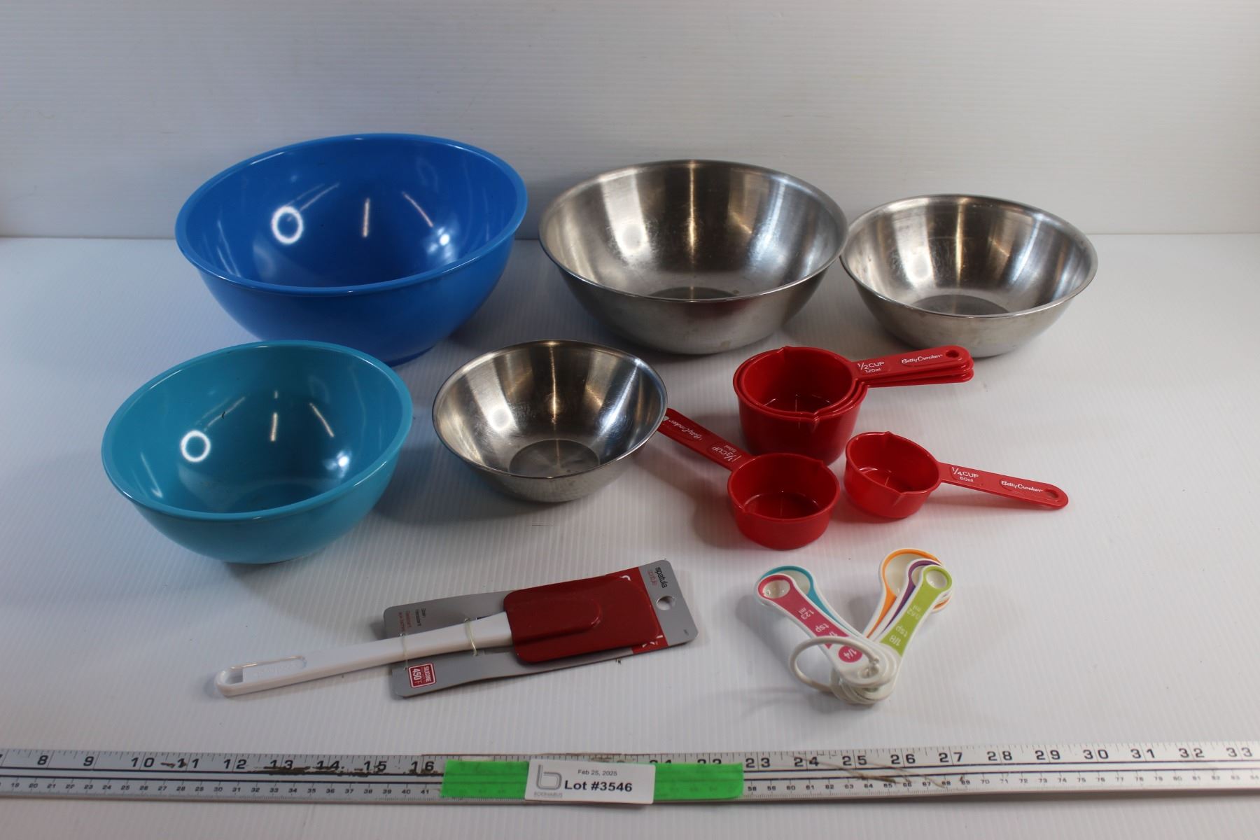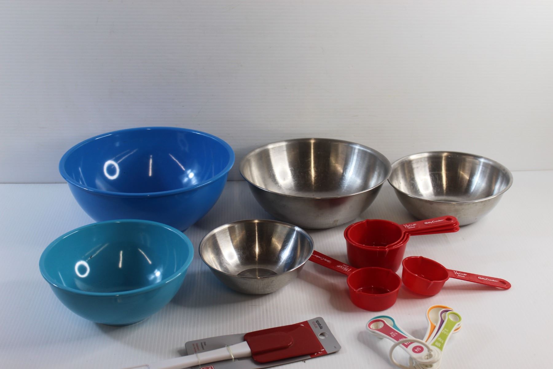 Plastic & Metal Bowls, Measuring Cups and Spatula