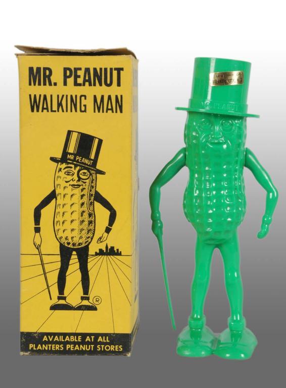 1950s. Green walker toy has original gold store sticker on the front of hat. Includes original box with one piece off the top flap and various green and red pen marks; however, this box is extremely difficult to find. Condition (Near Mint). Size 8 - 1/4" x 3 - 3/4".