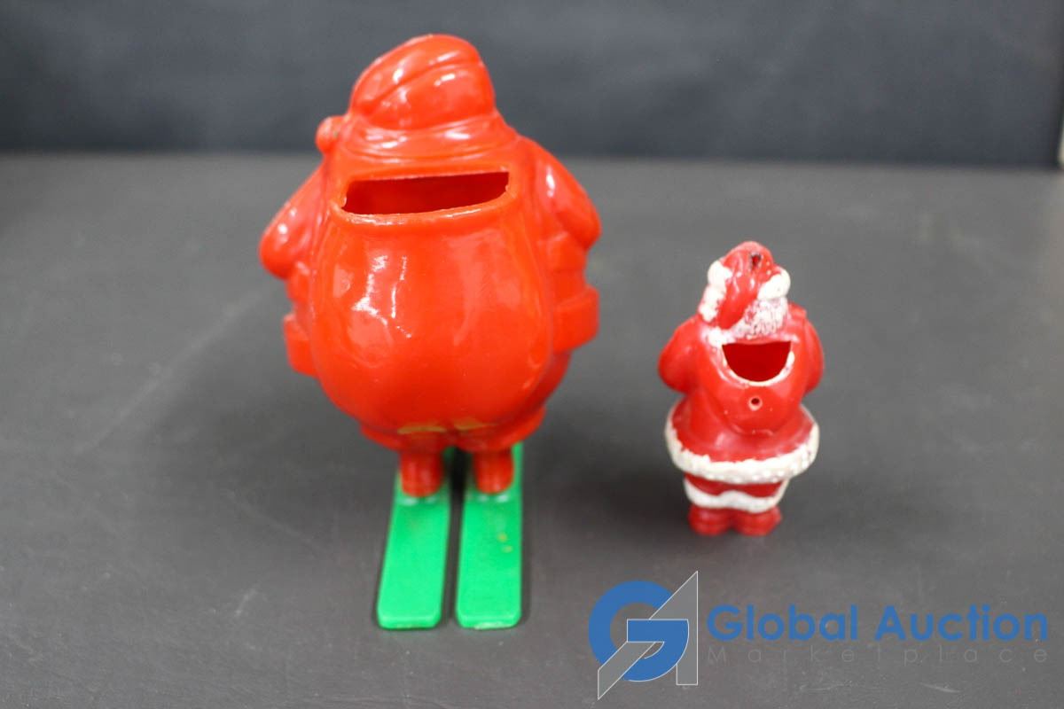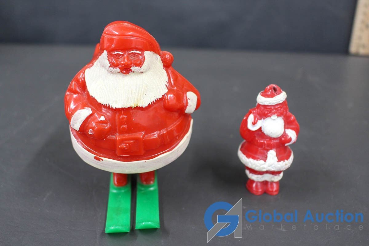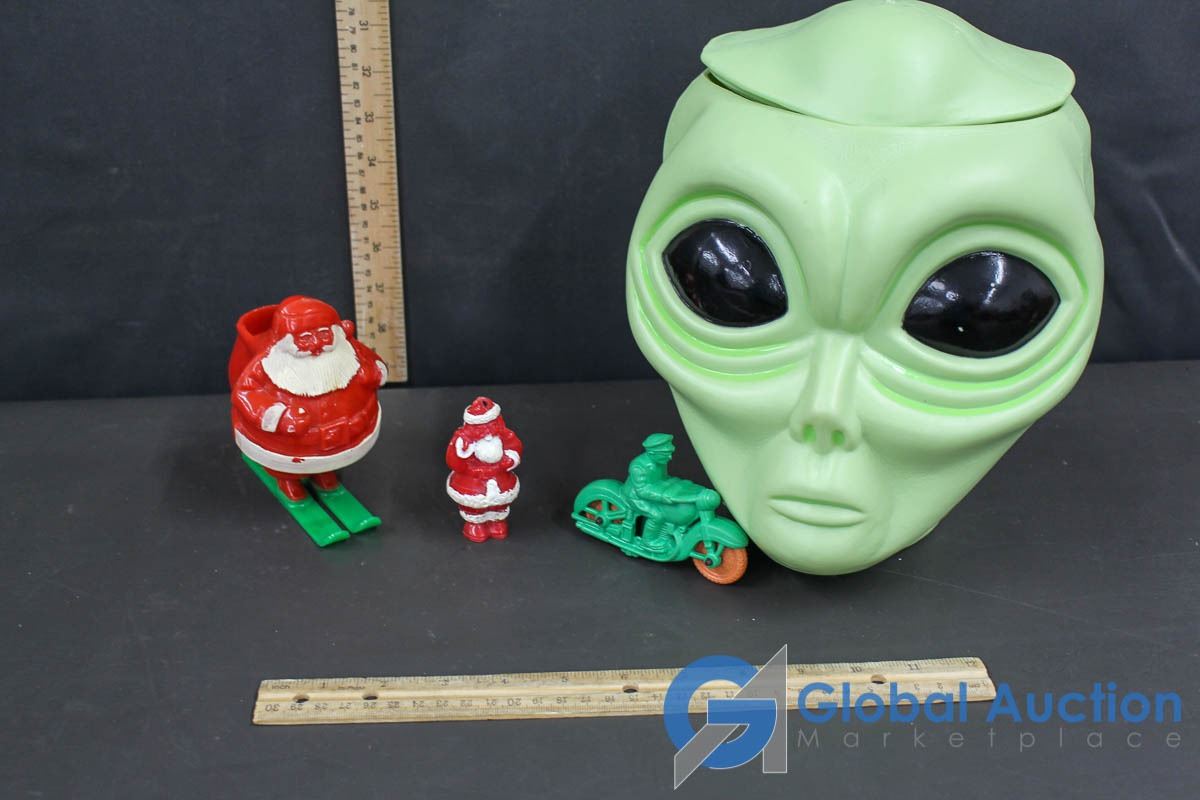 Plastic Santa Clause (2), Green Plastic Motorcycle Toy and Alien Pops Head
