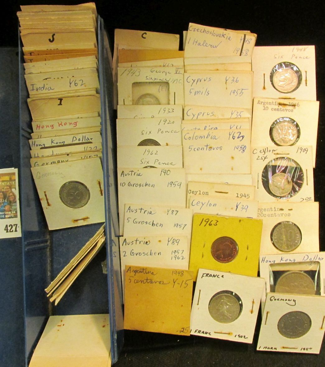 Plastic Stock Box full of Old Foreign coins most of which have been attributed and includes several Silver pieces. Several nice high grade pieces included.