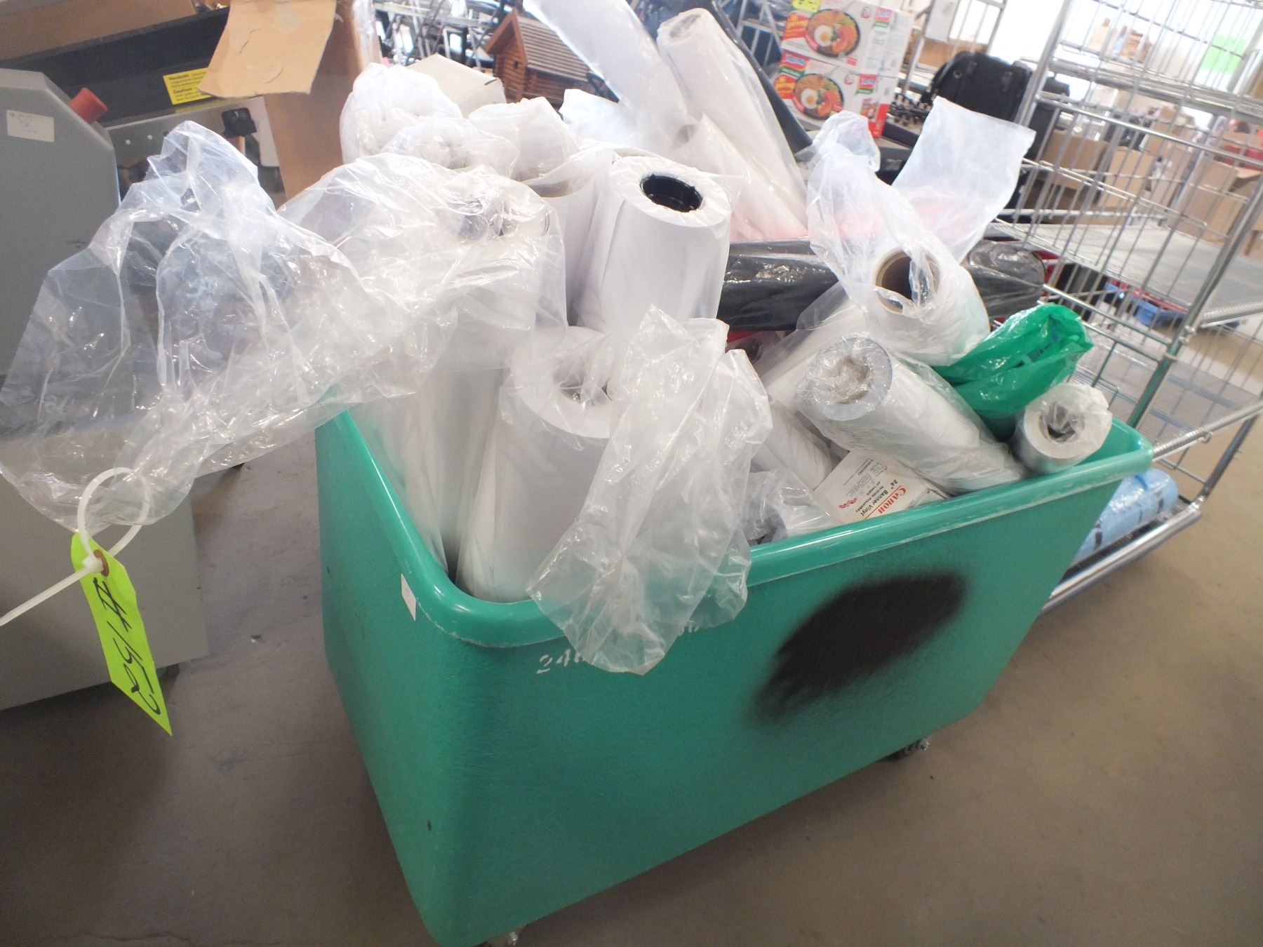 Plastic Storage Bin On Wheels w/ Assorted Rolls Of Paper...used