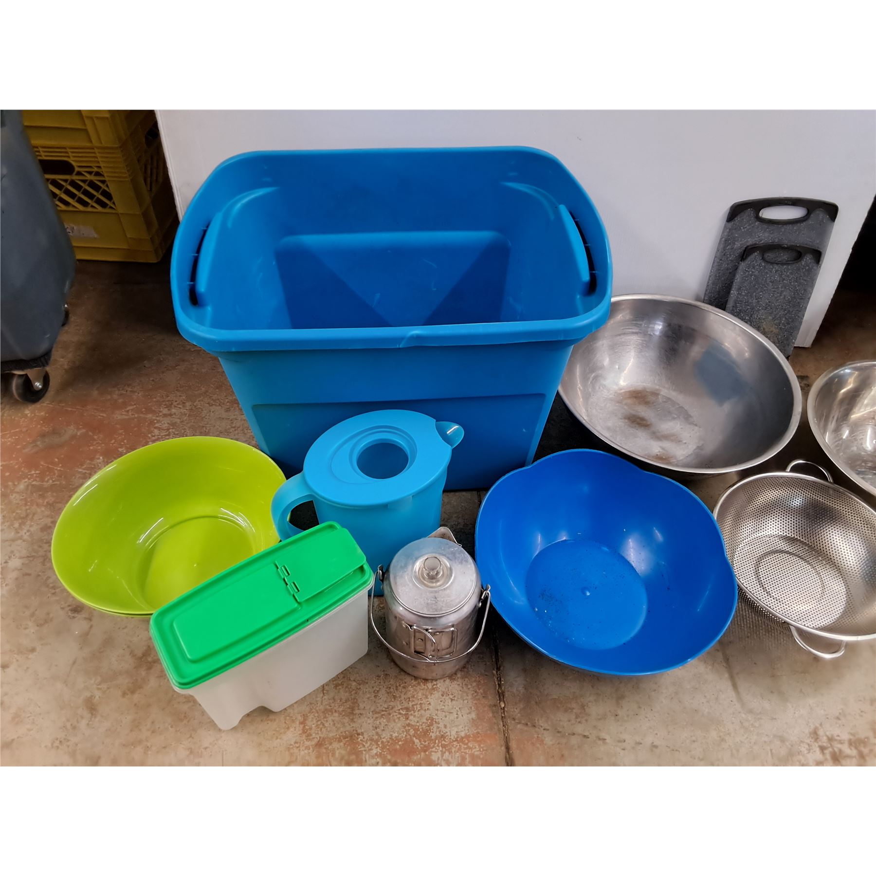 *Plastic Storage Tote 23" x 18" x 16", Plastic & Metal Bowls, Strainer, Cutting Boards, Tea Pot