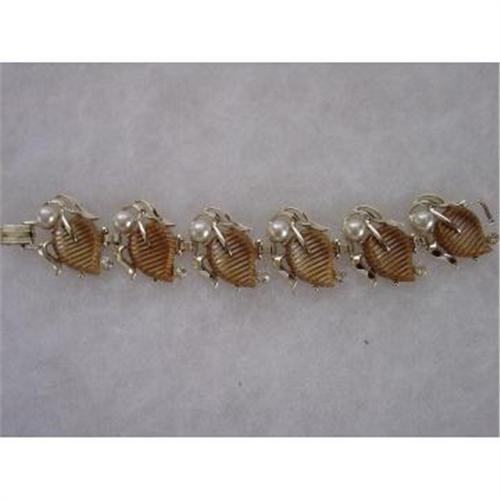 Here is a lovely thermoset or plastic 1950s Acorn bracelet. There are 6 individual links each with 1 rhinestone, 1 pearl and 1 thermoset acorn plastic piece. The metal is gold toned in color. It is in mint condition. This bracelet is 7 inches in length