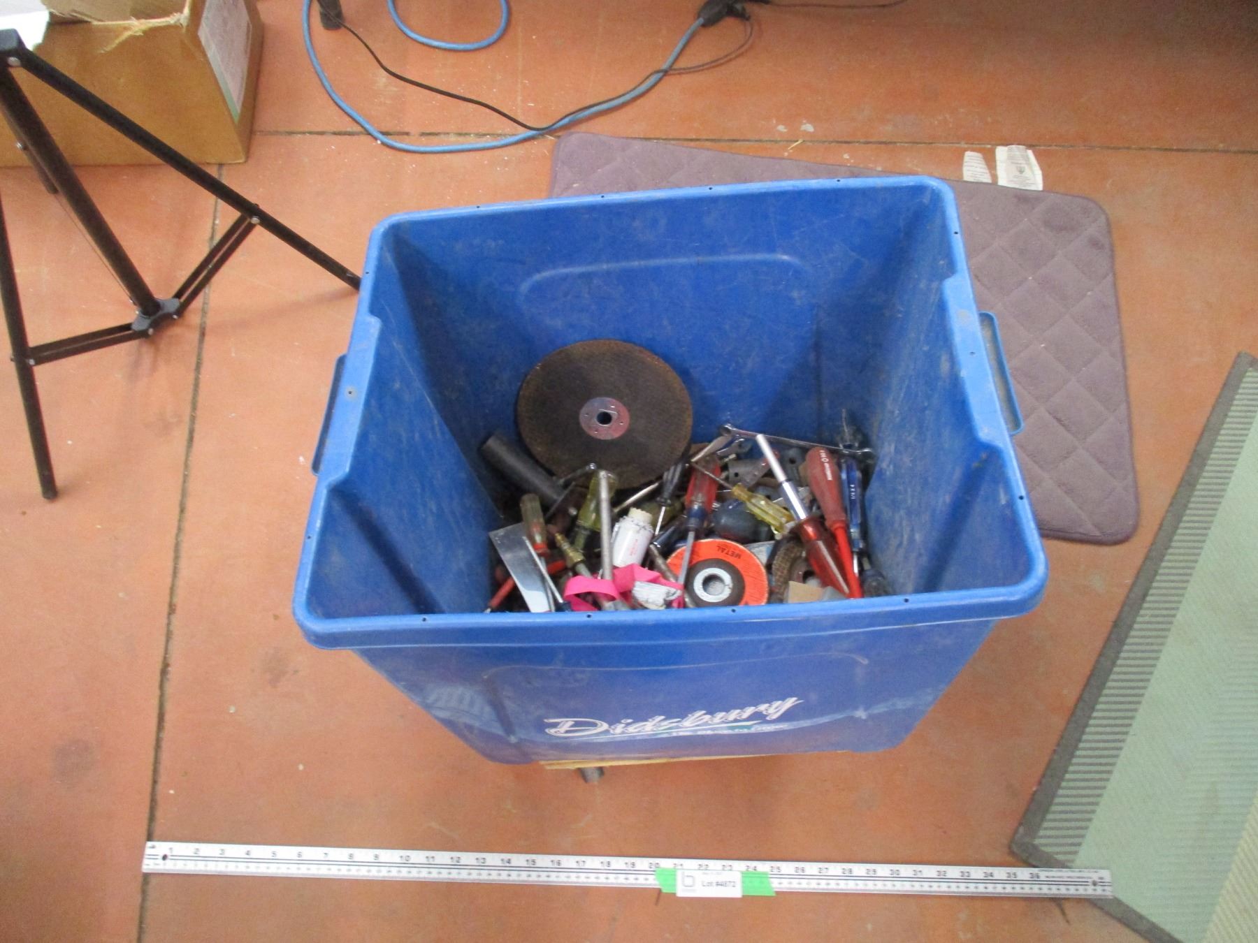 Plastic Tote On Wheels (Missing 1 Wheel) with Hand Tools and Misc