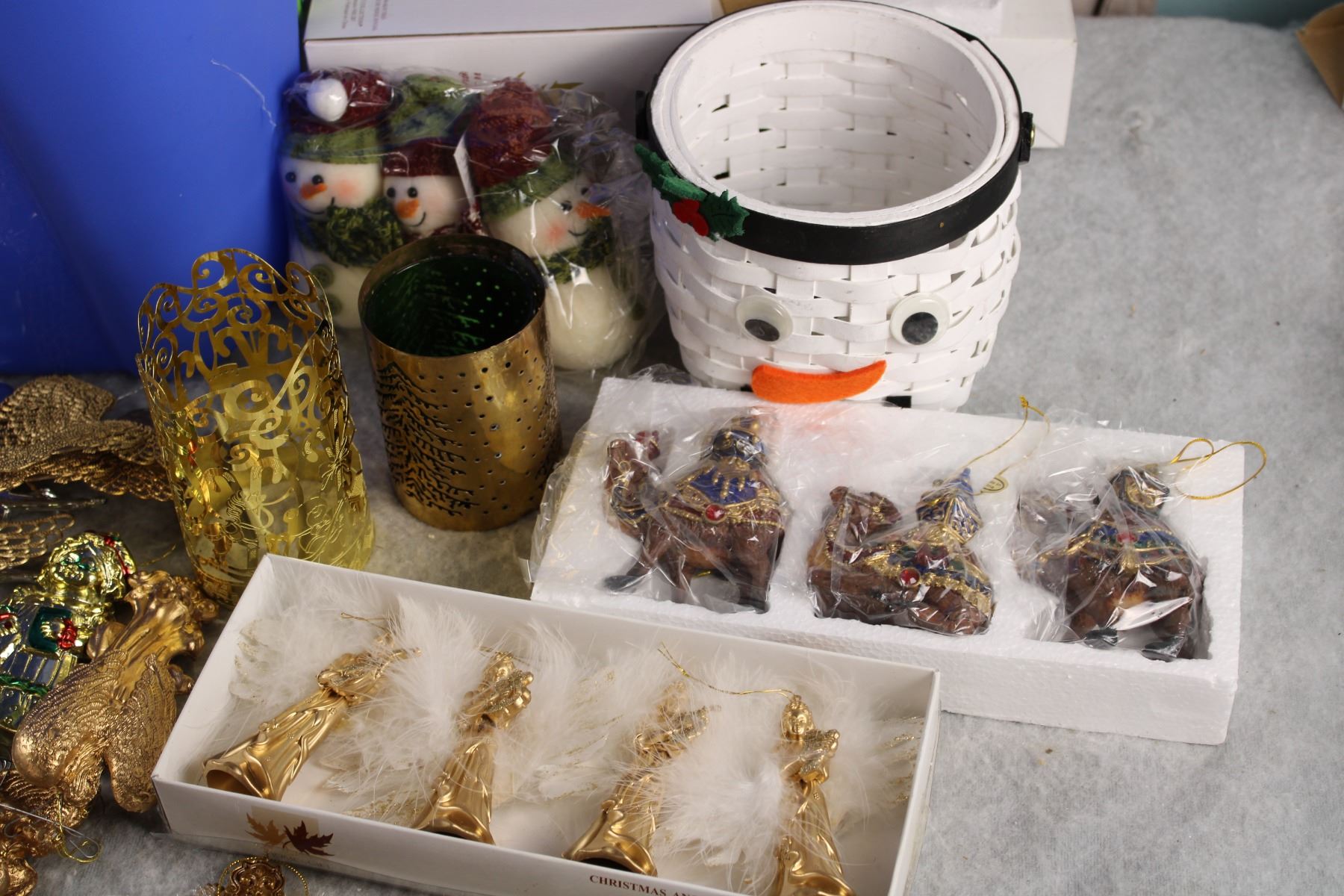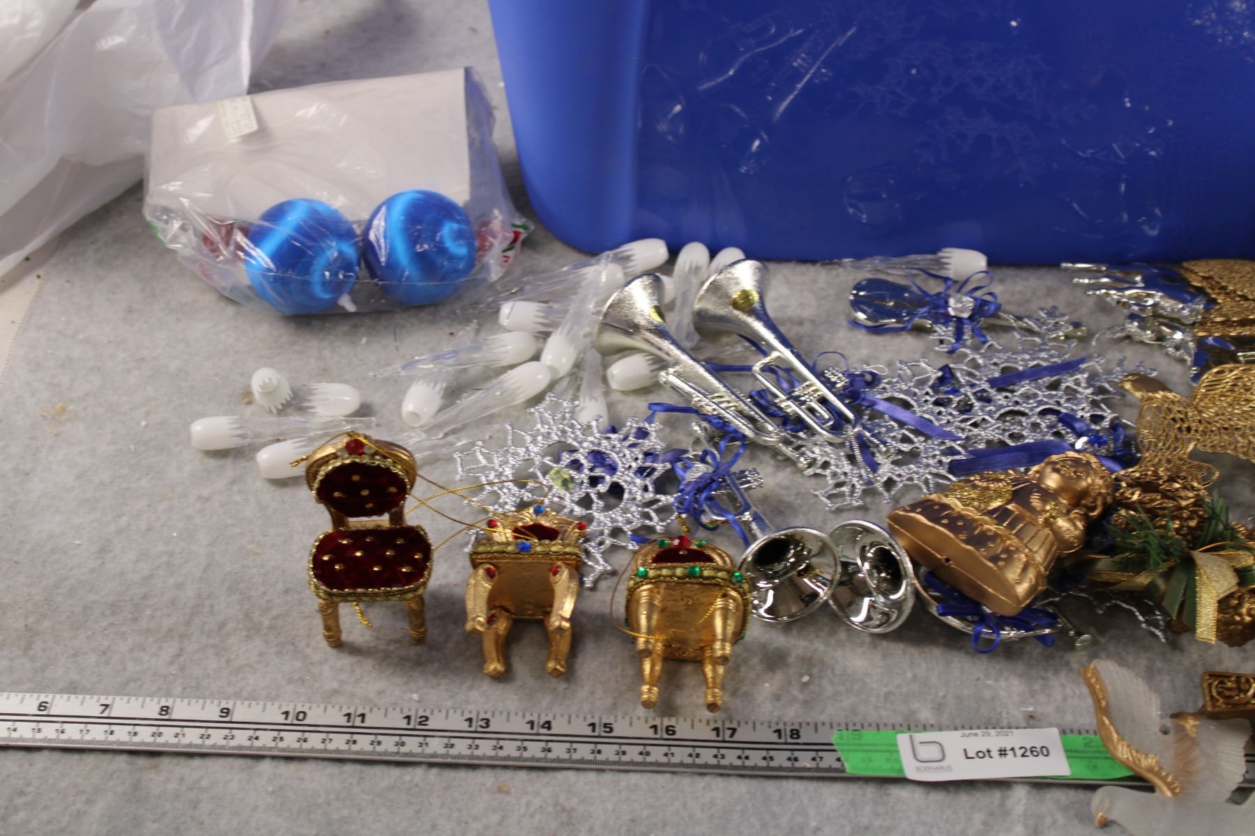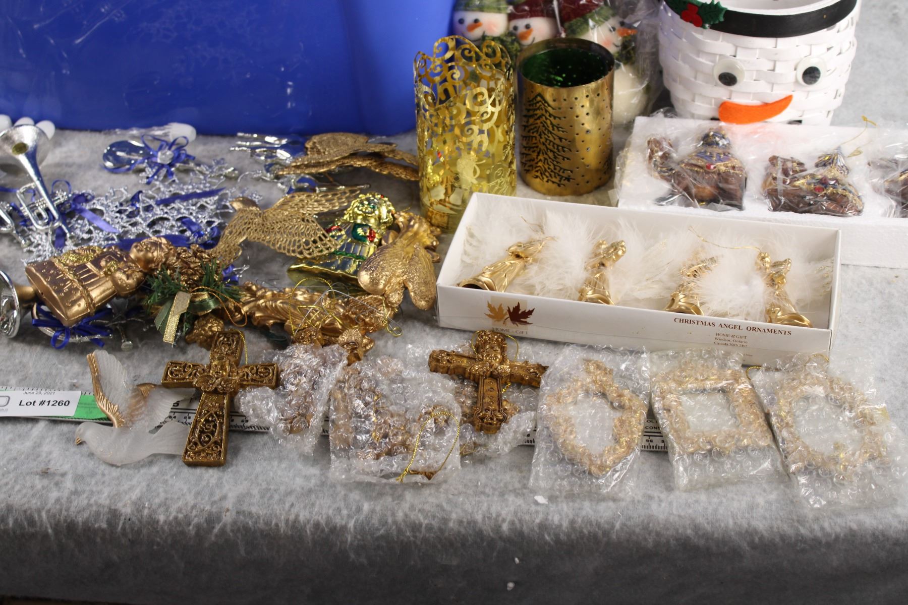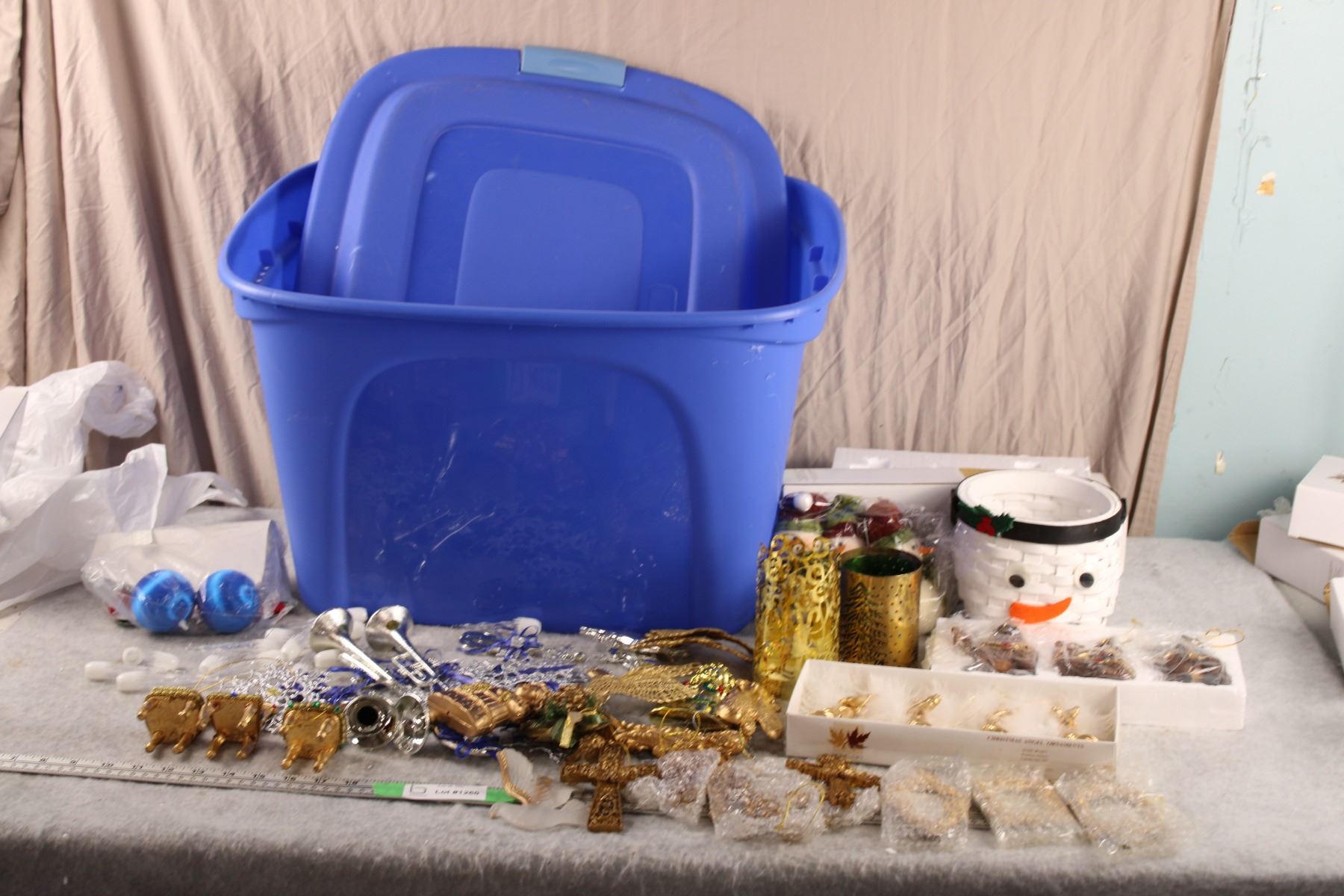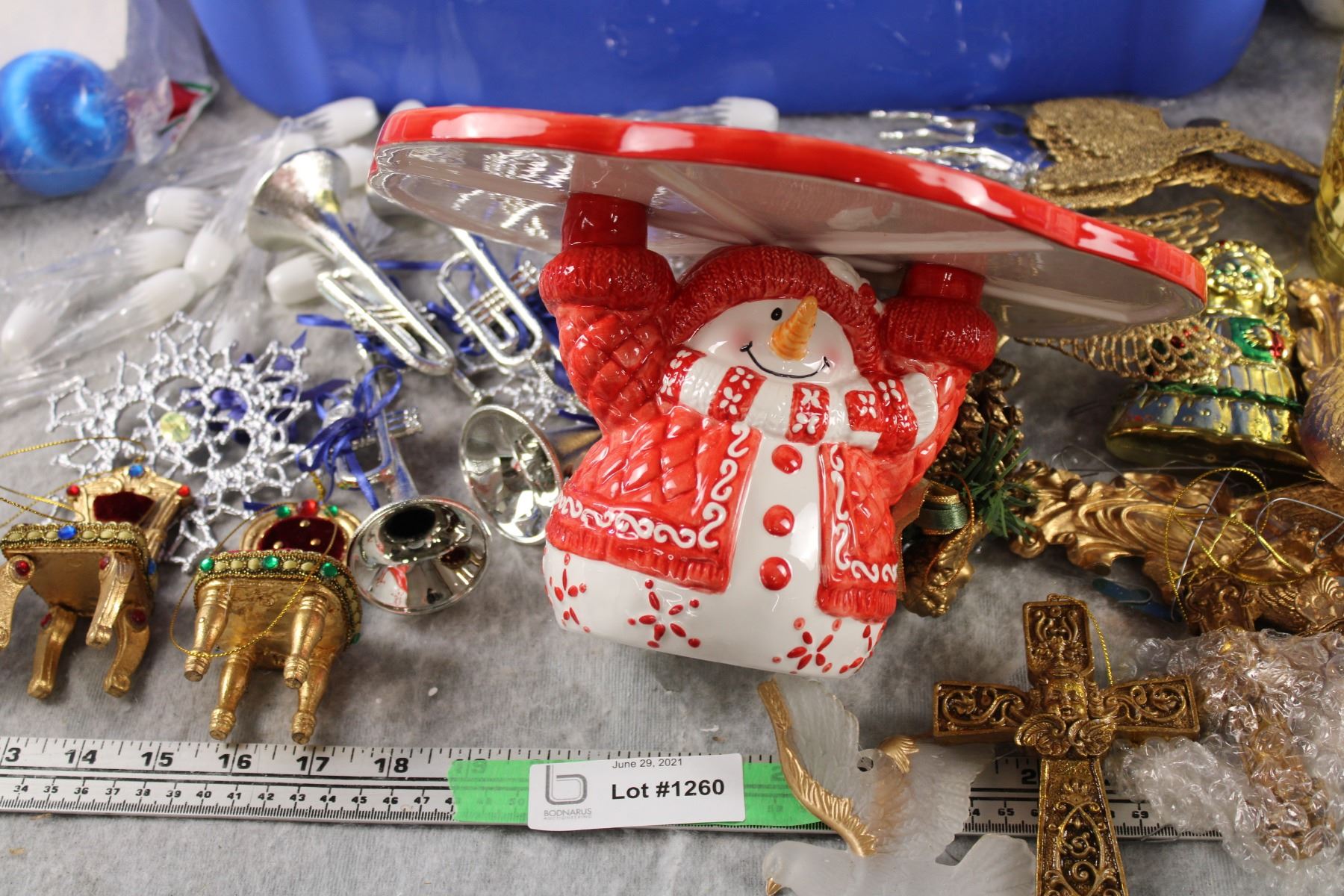 Plastic Tote filled with Christmas Decor + Snowman Peppermint Tray