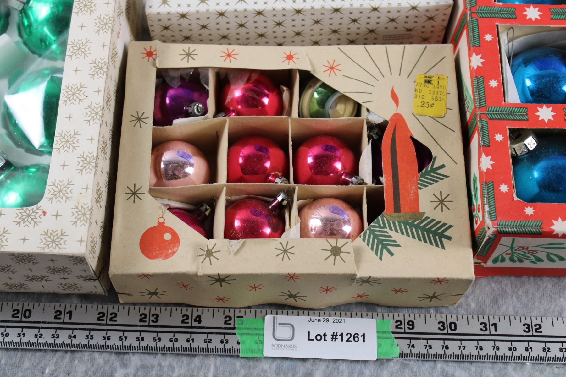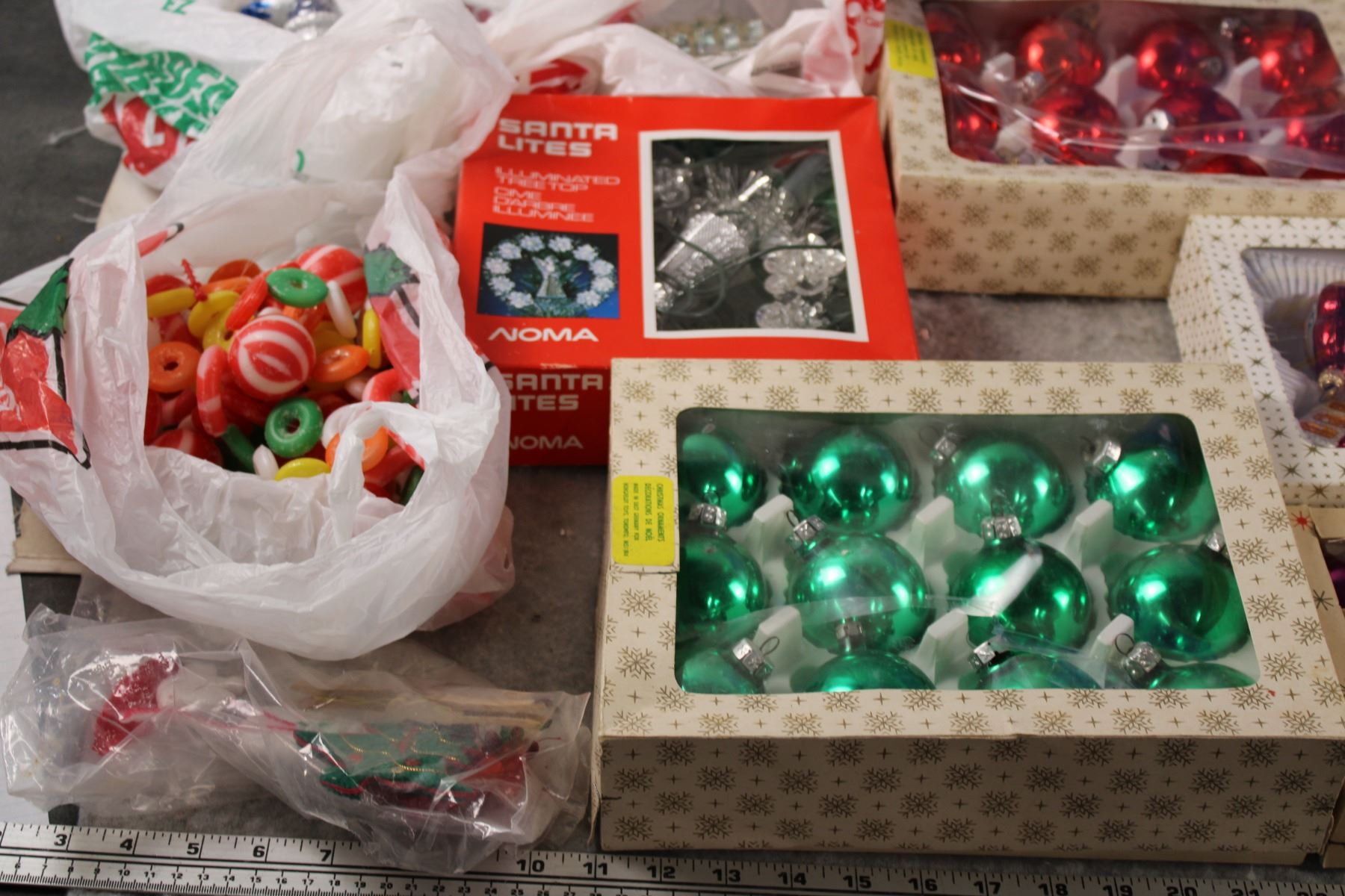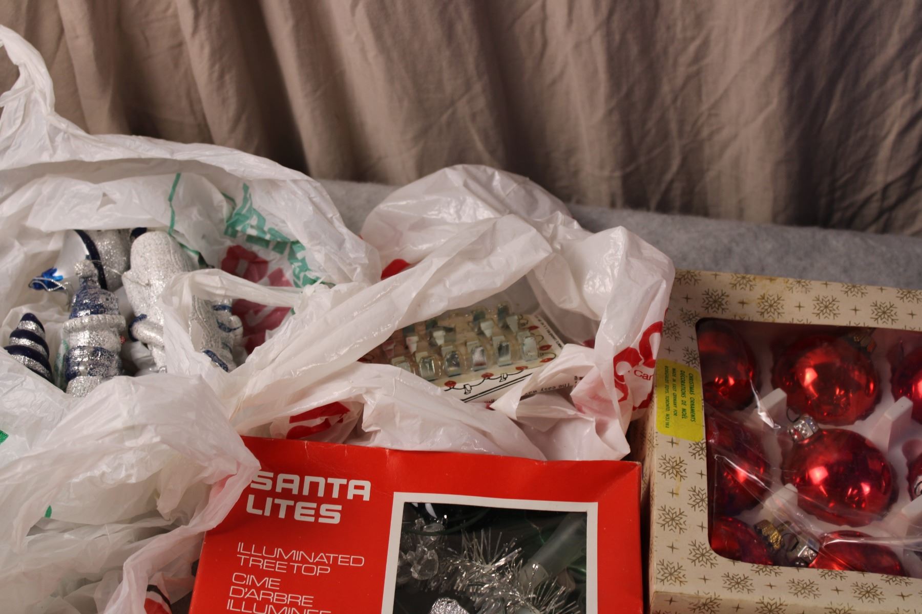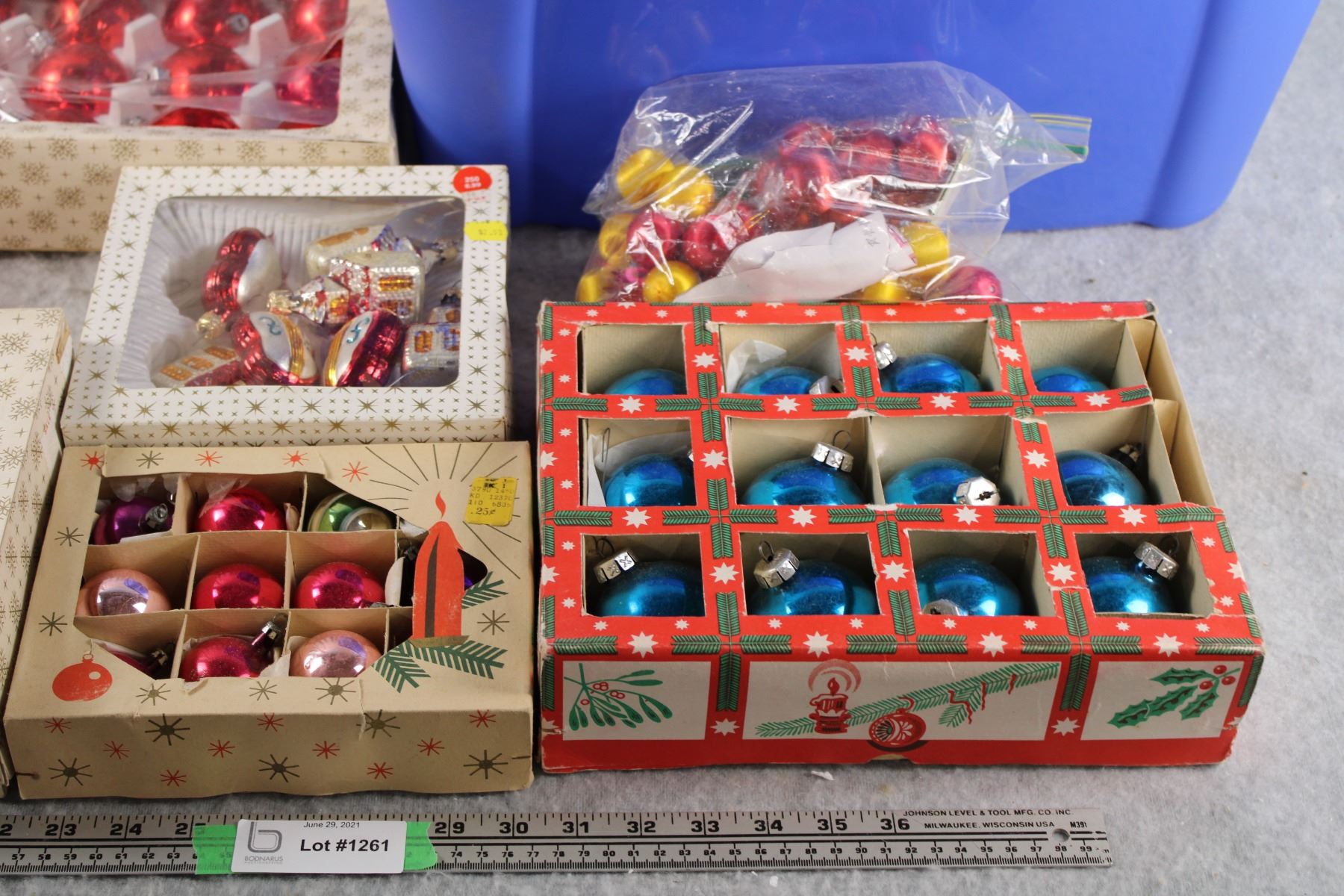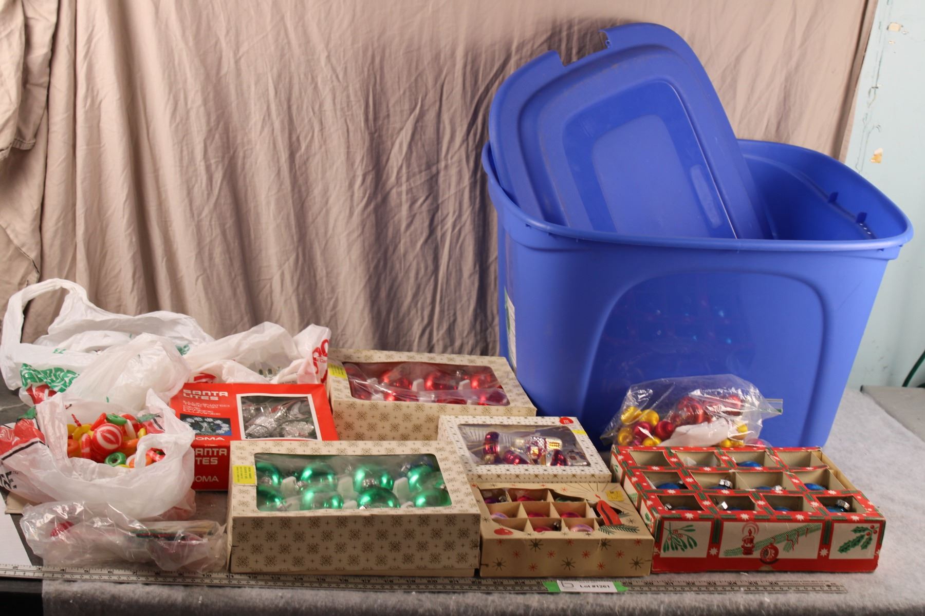Plastic Tote with Christmas Tree Bulbs + decorations