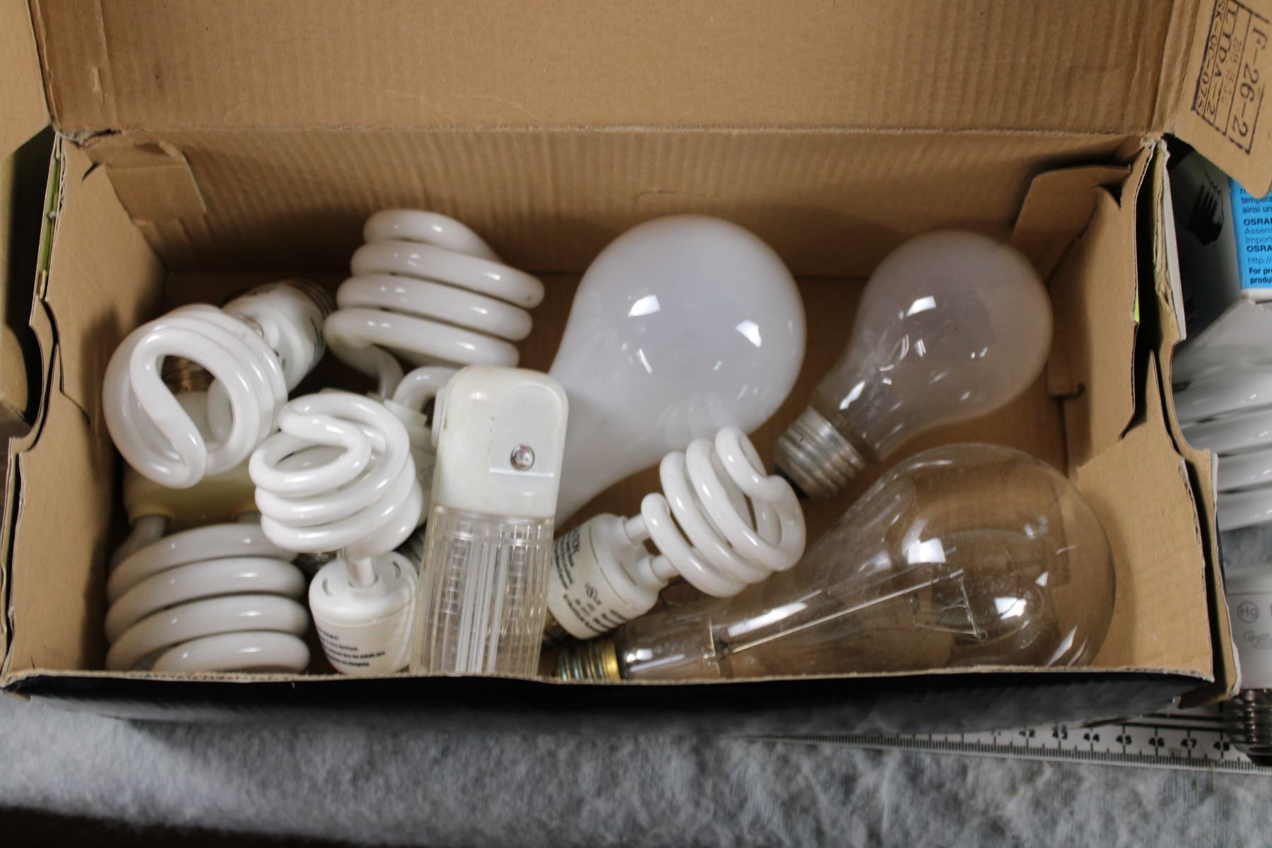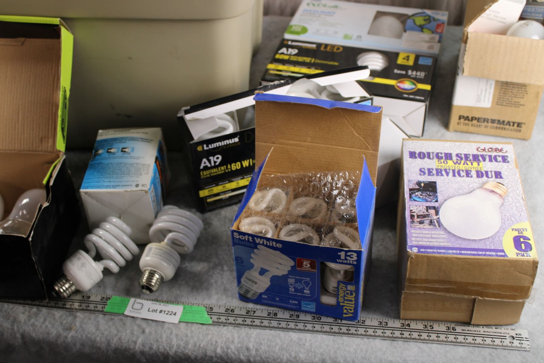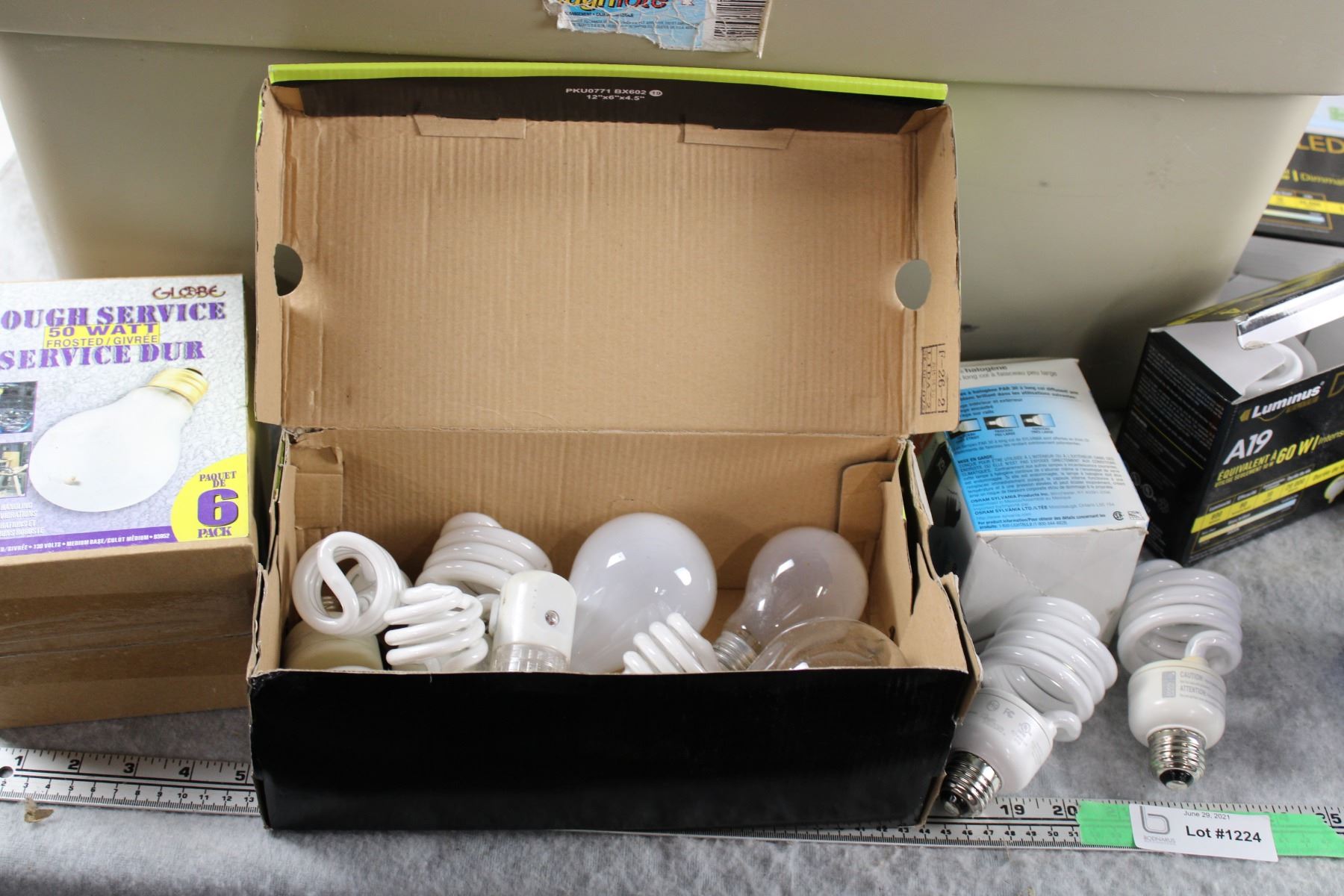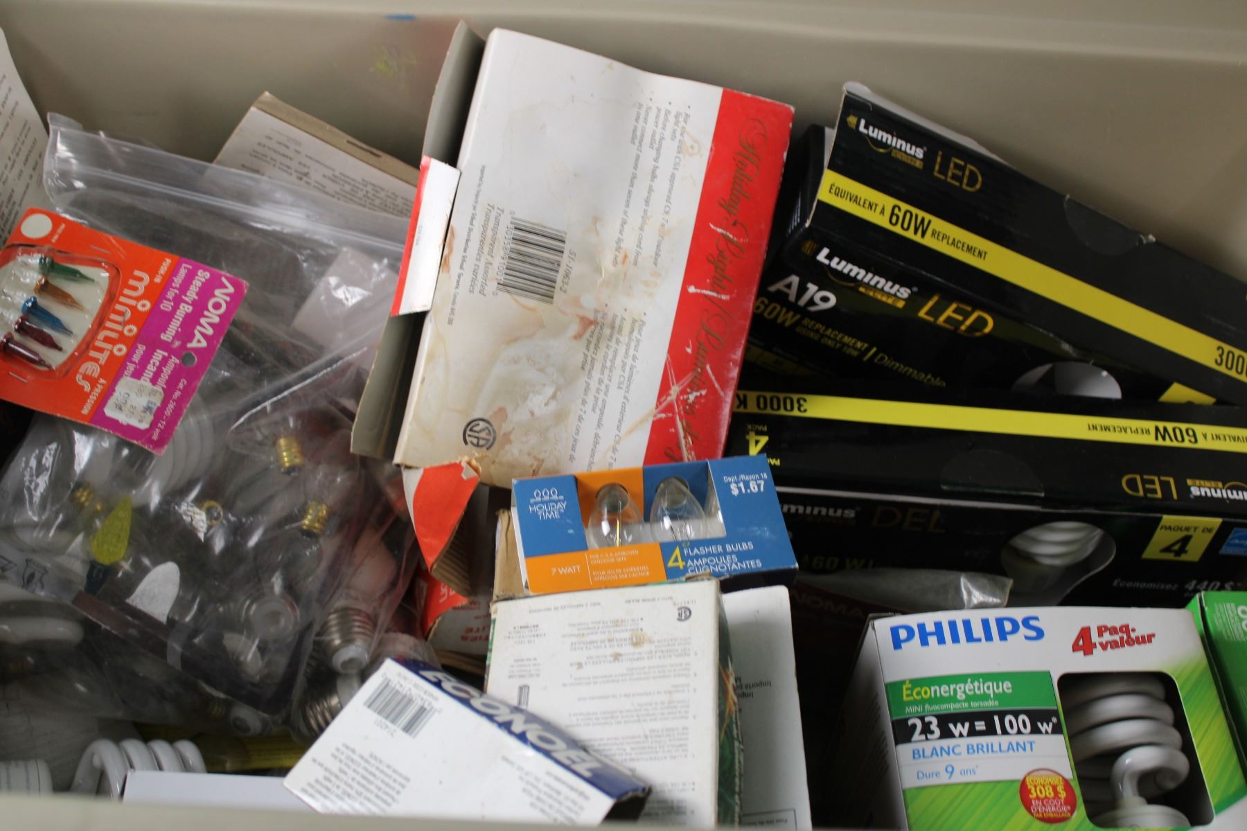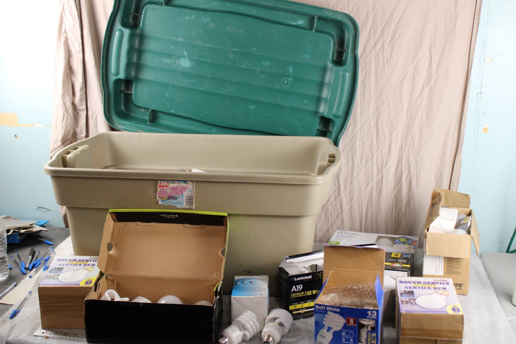 Plastic Tote with Lot of Light Bulbs - some new and some used, all types