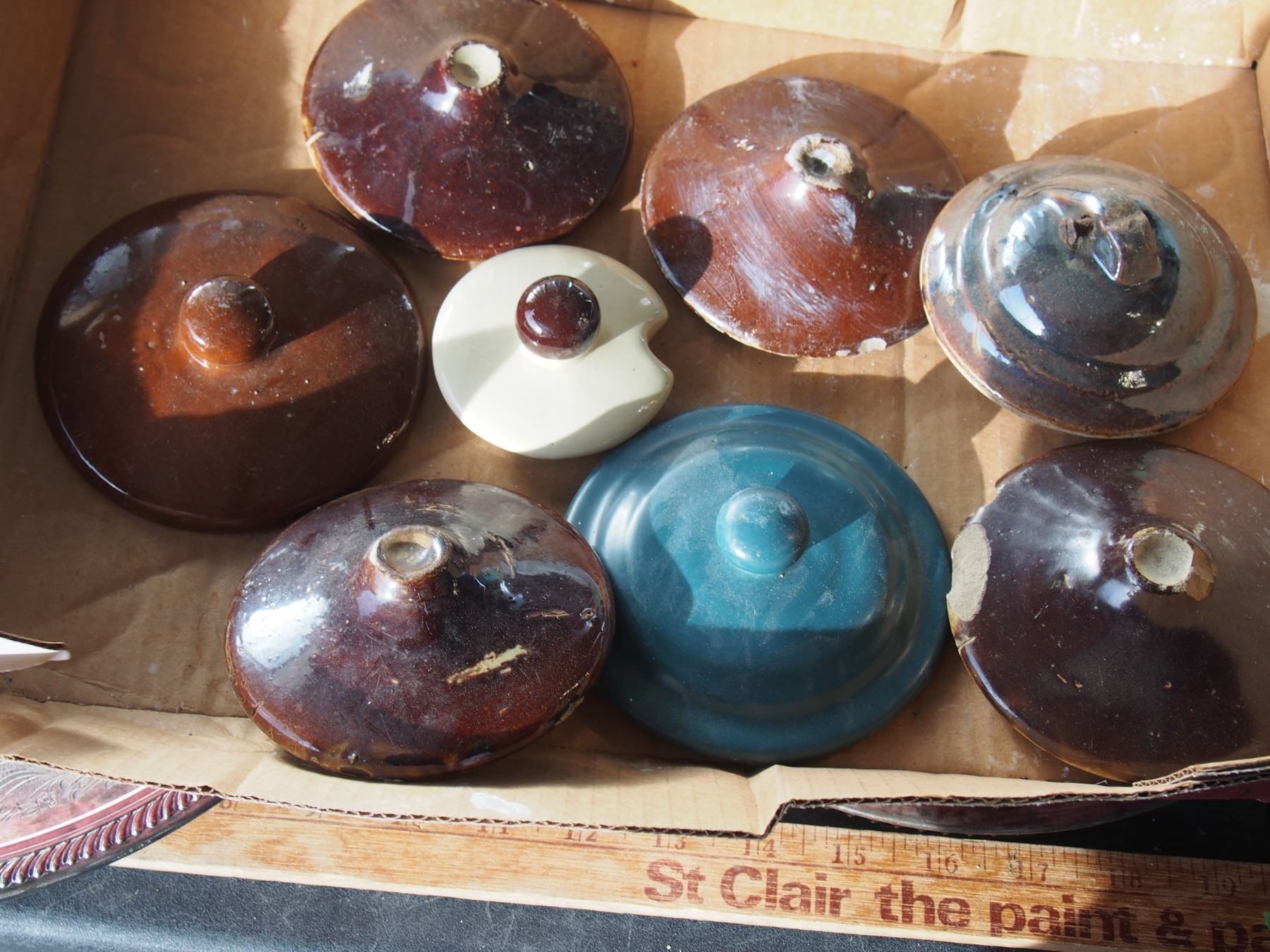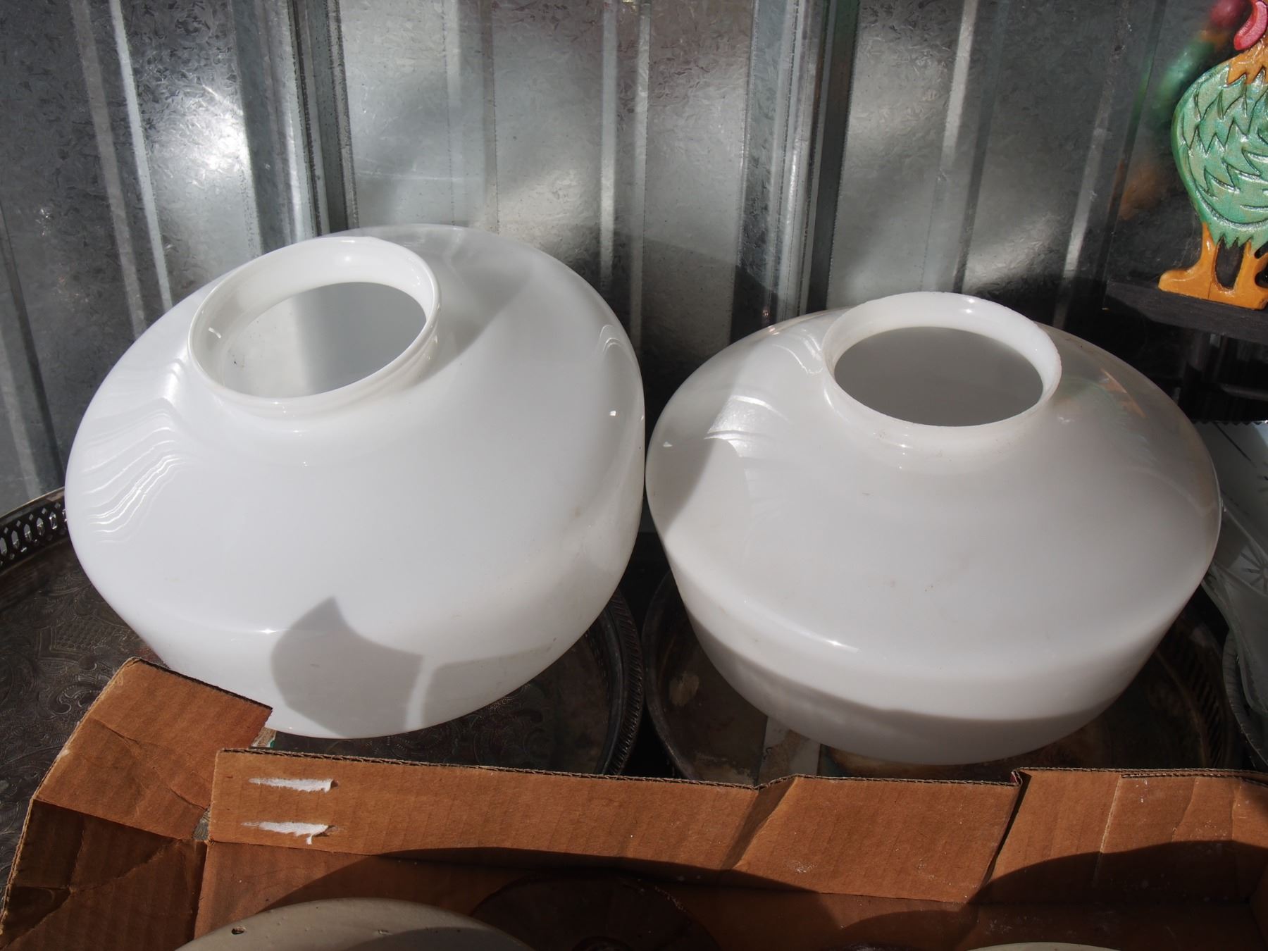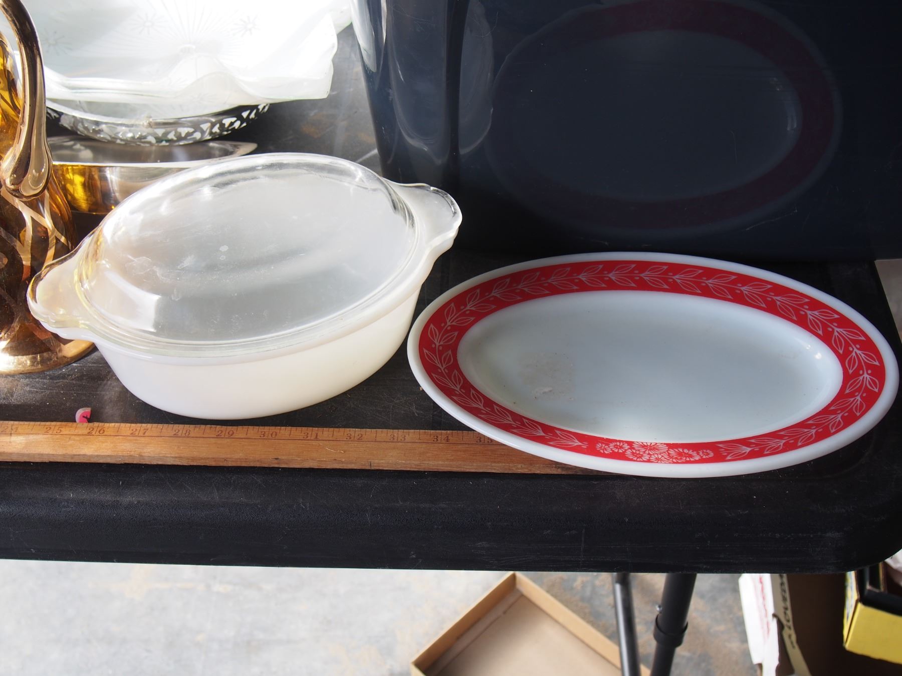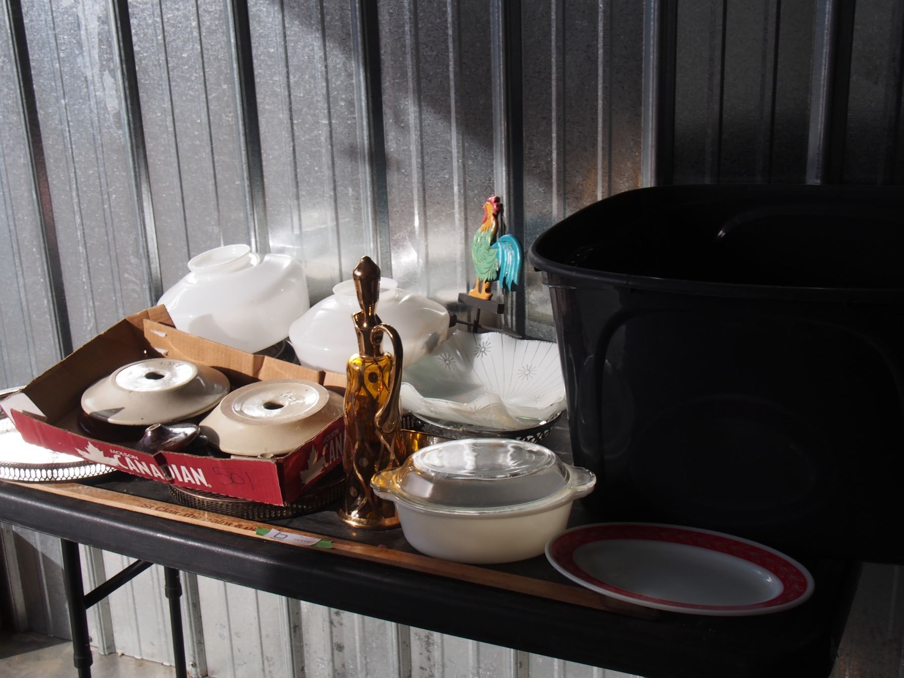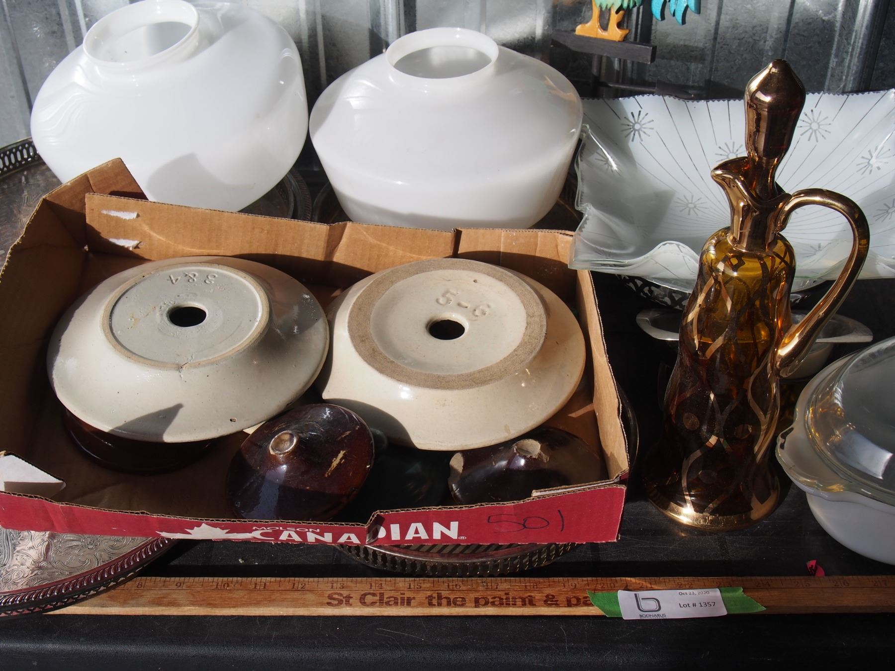 Plastic Tote with Silver Plated Items, Glass Light Shades, Fire King Casserole, Decanter Pitcher etc