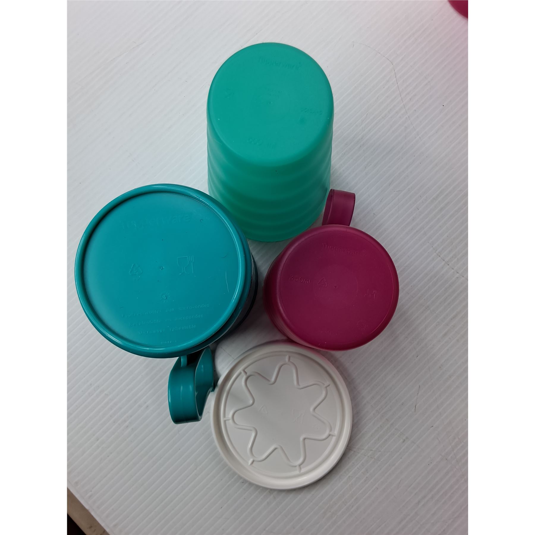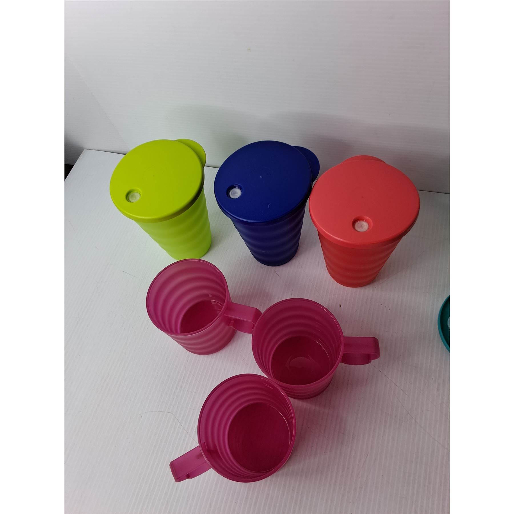 Plastic Tupperware Lot- (4) Cups with Lids, (6) Mugs