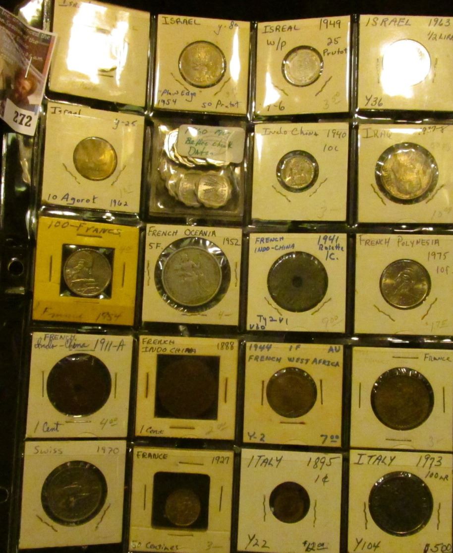 Plastic page with (14) various denomination Israel Coins, most of which are high grade; 1940 Indo China Coin; 1937 Iraq Silver Coin; 1954 France 100 Francs; (6) various French Colony Coins; 1923 France 2 Francs high grade; 1927 France 50c High grade; & (2) High Grade Italian Coins.They are all carded and priced to sell at over $80.00.