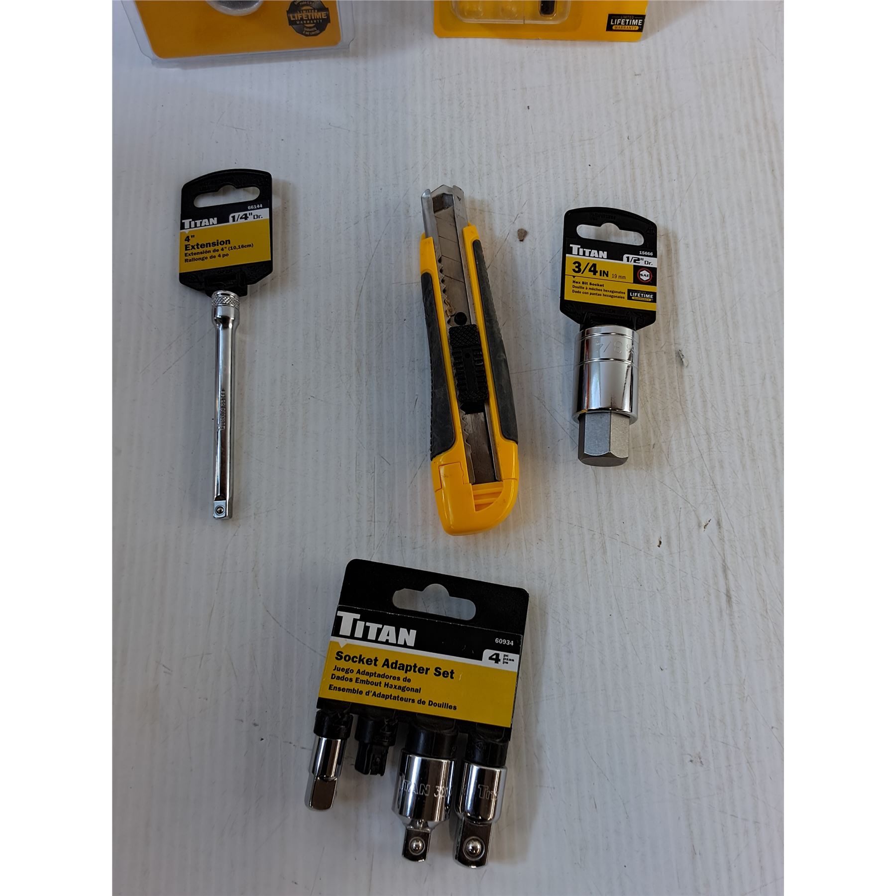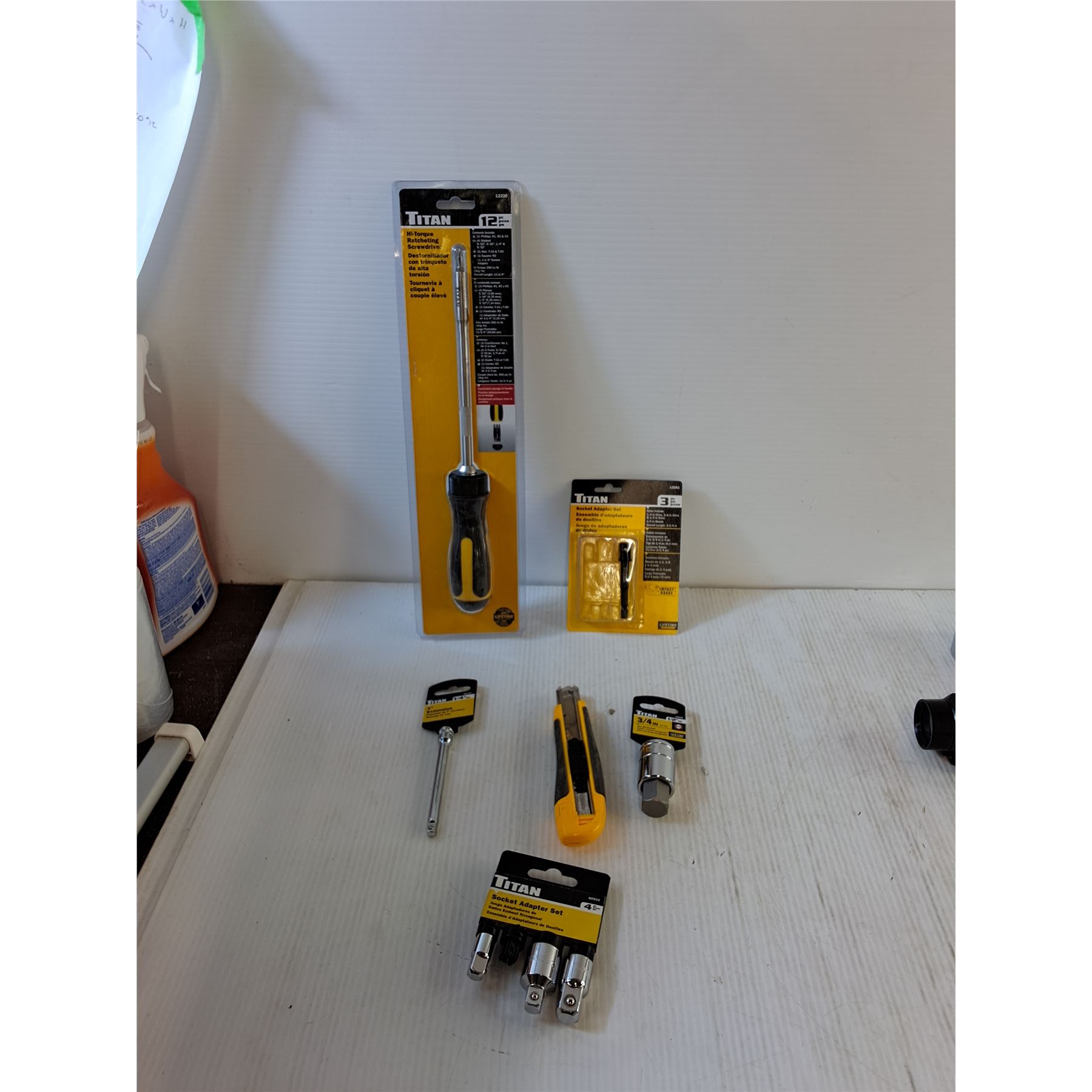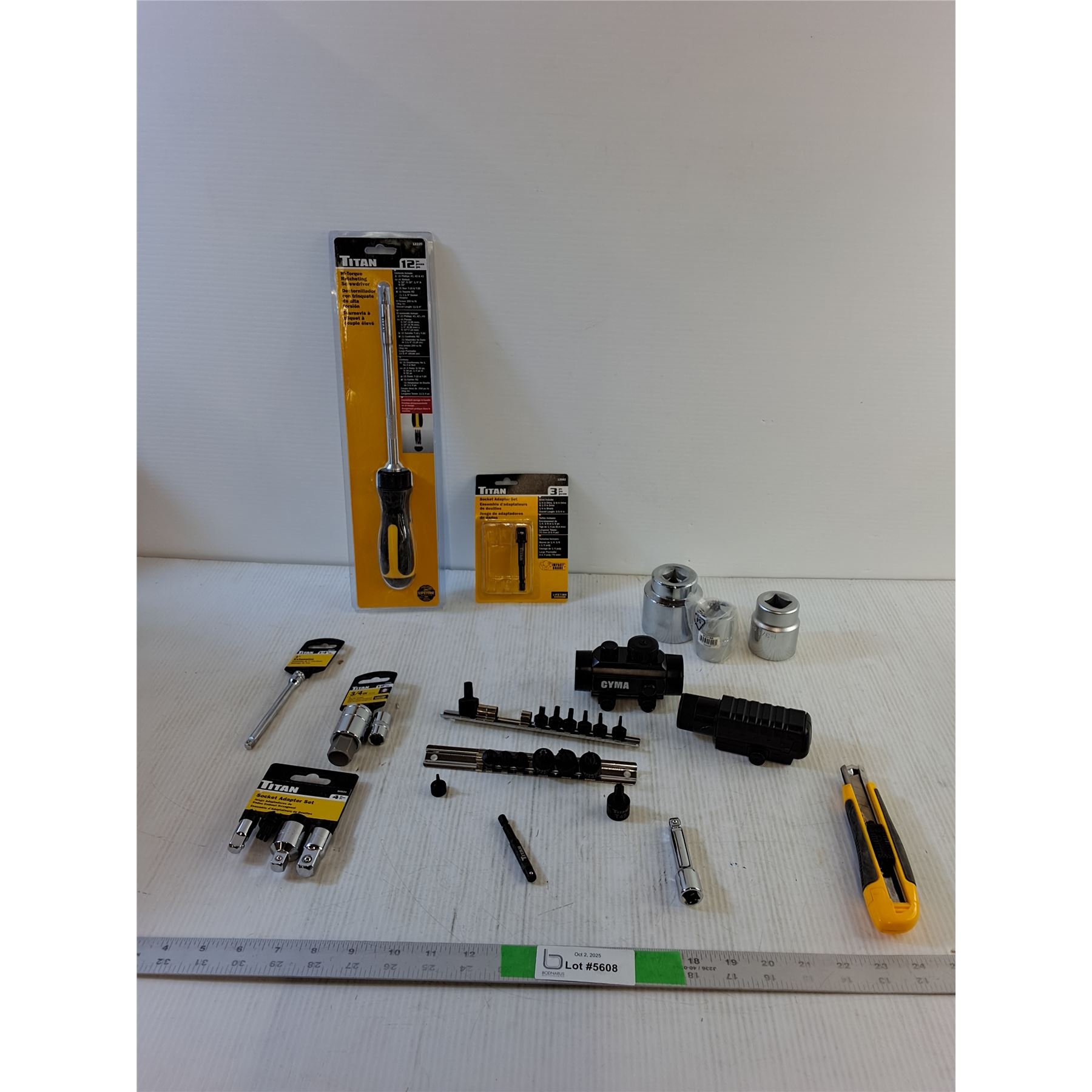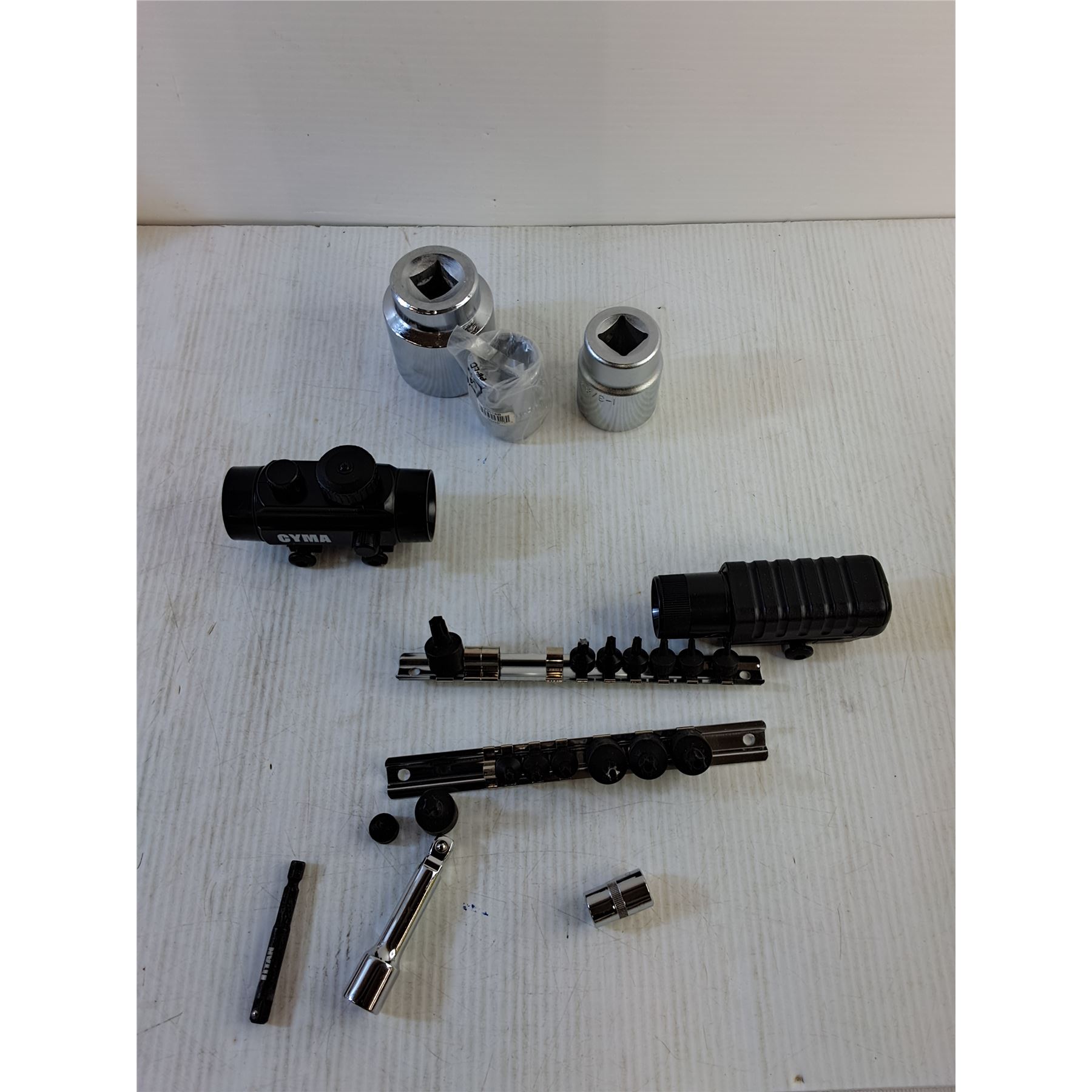 Plastic sights, Ratcheting Screwdriver, Utility Knife, Socket Adapter Set, Etc