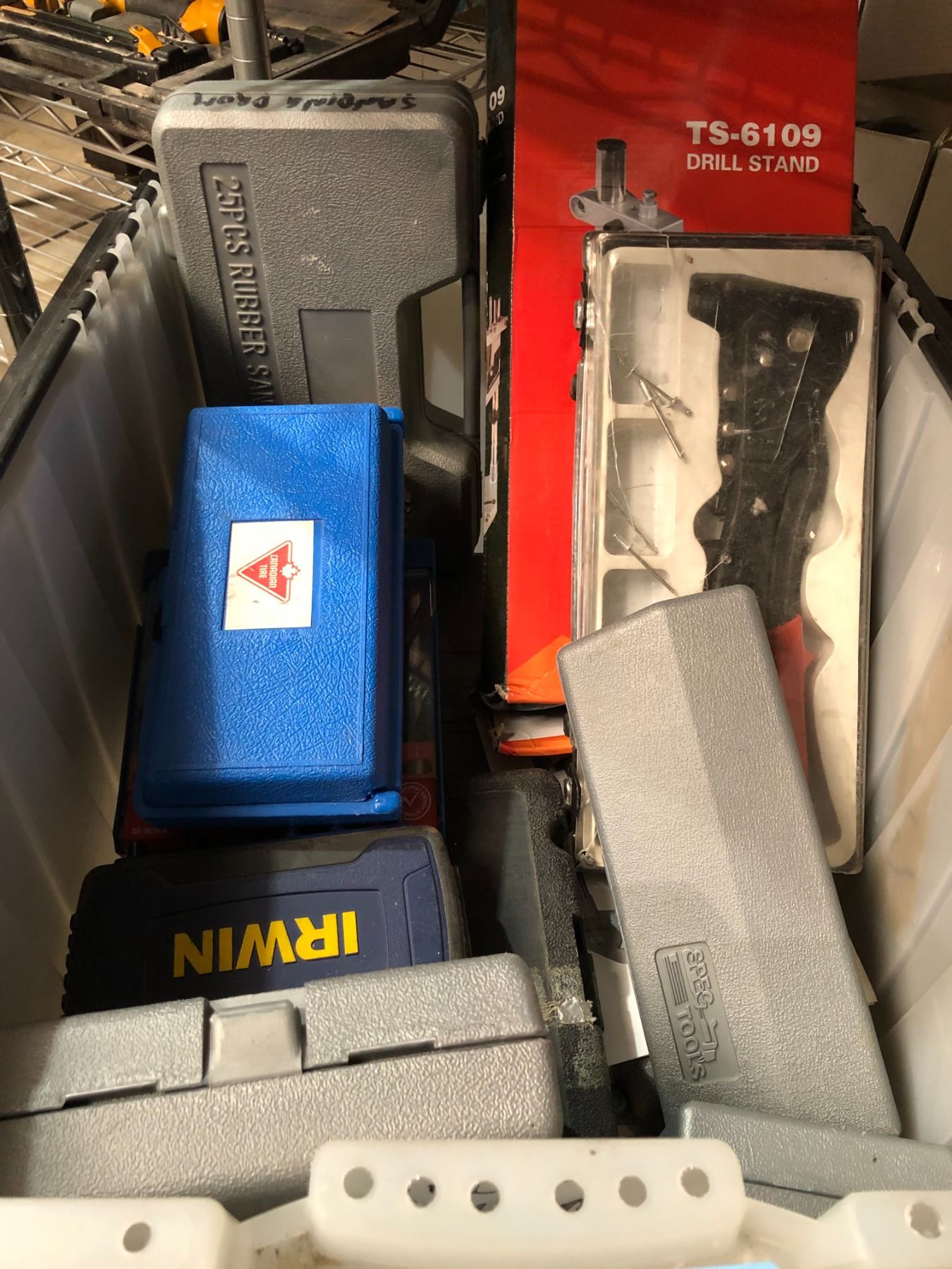 Plastic storage bin filled w/assorted tool sets - drill bit sets/socket sets/pop rivet sets/drill stand/etc...