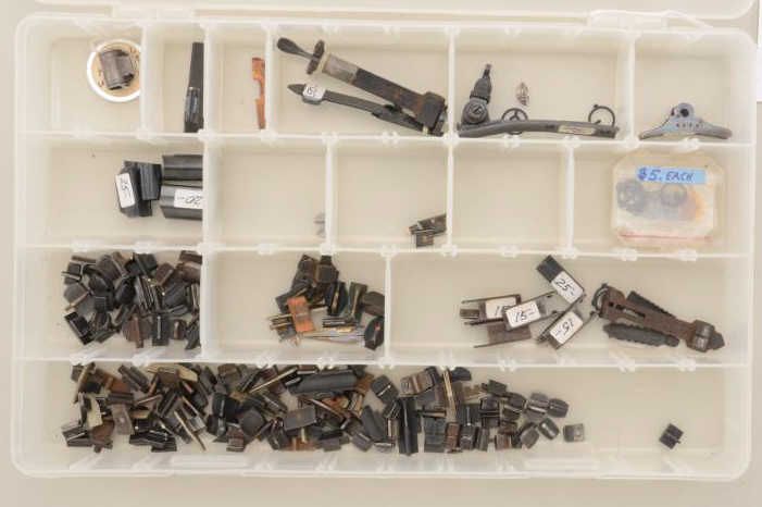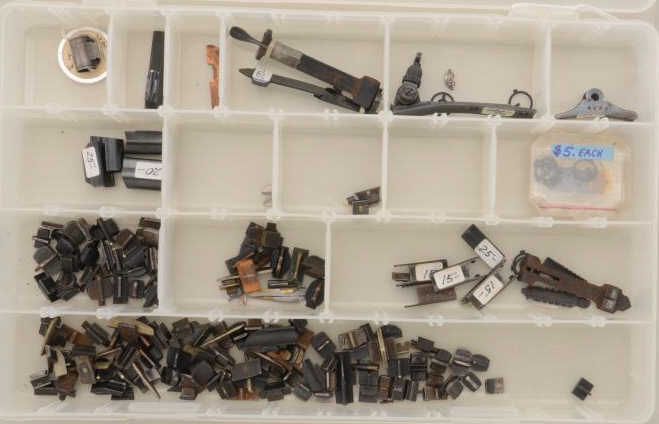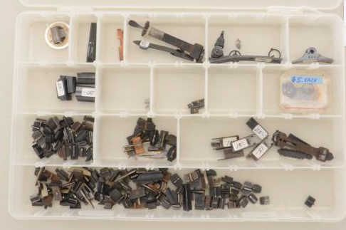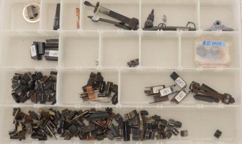 Plastic storage container full of front sights, elevators, sight parts, 2 rear sights, 1 Savage tang sight, removable reticules, and hoods for sights. Over 120 pieces and priced at $25-$100 each bycollector who took them to shows. Most front sights are proper for Winchesters, including a couple old large blade front sights. Est.: $350-$700