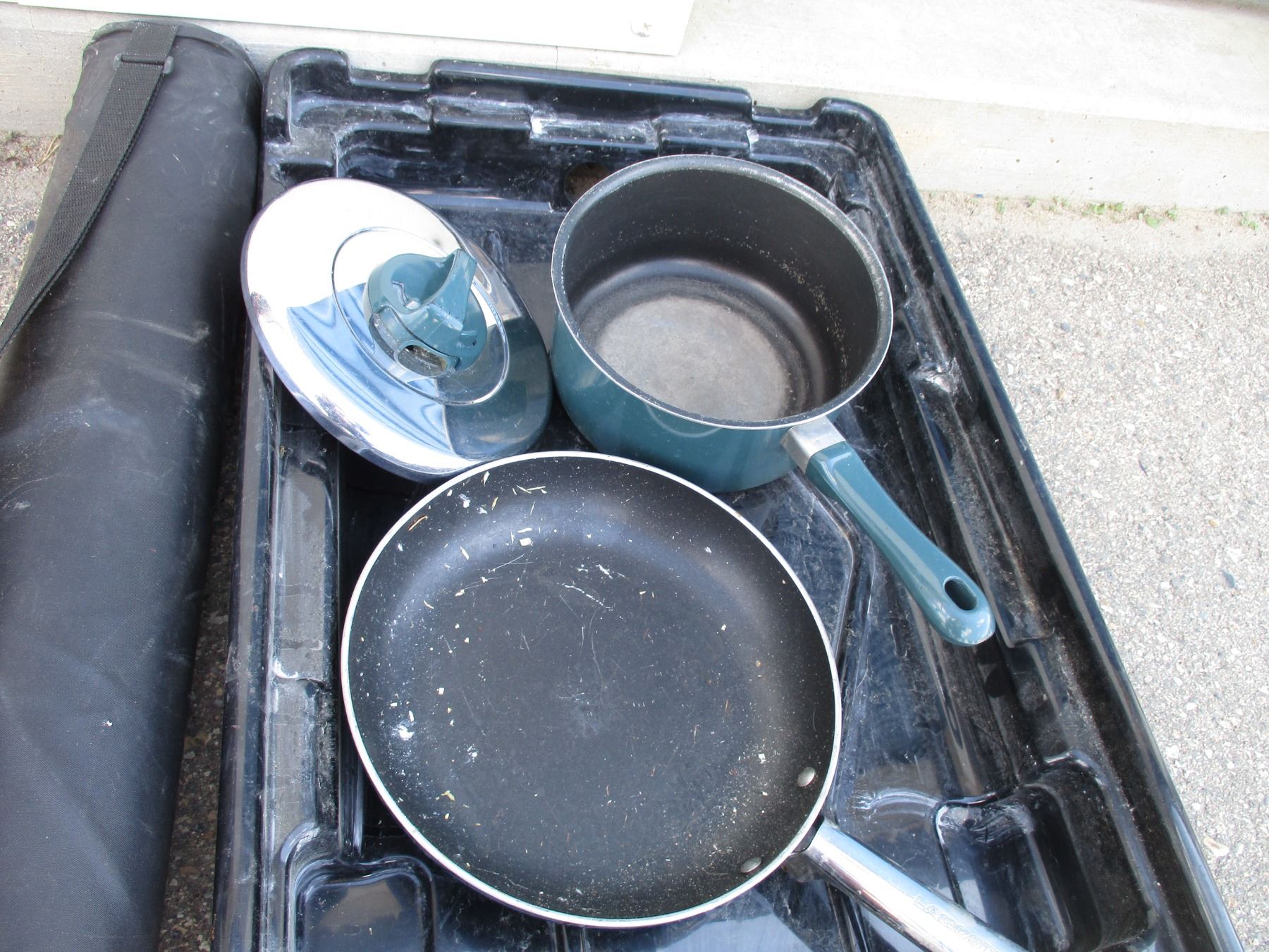 Plastic tray, pots + misc