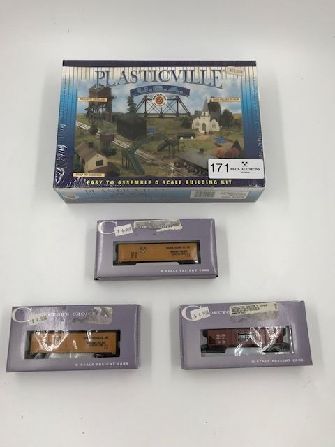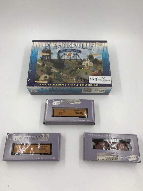 Plasticville 0 Scale Building Kit and Three Conductors Choice N Scale Train Cars