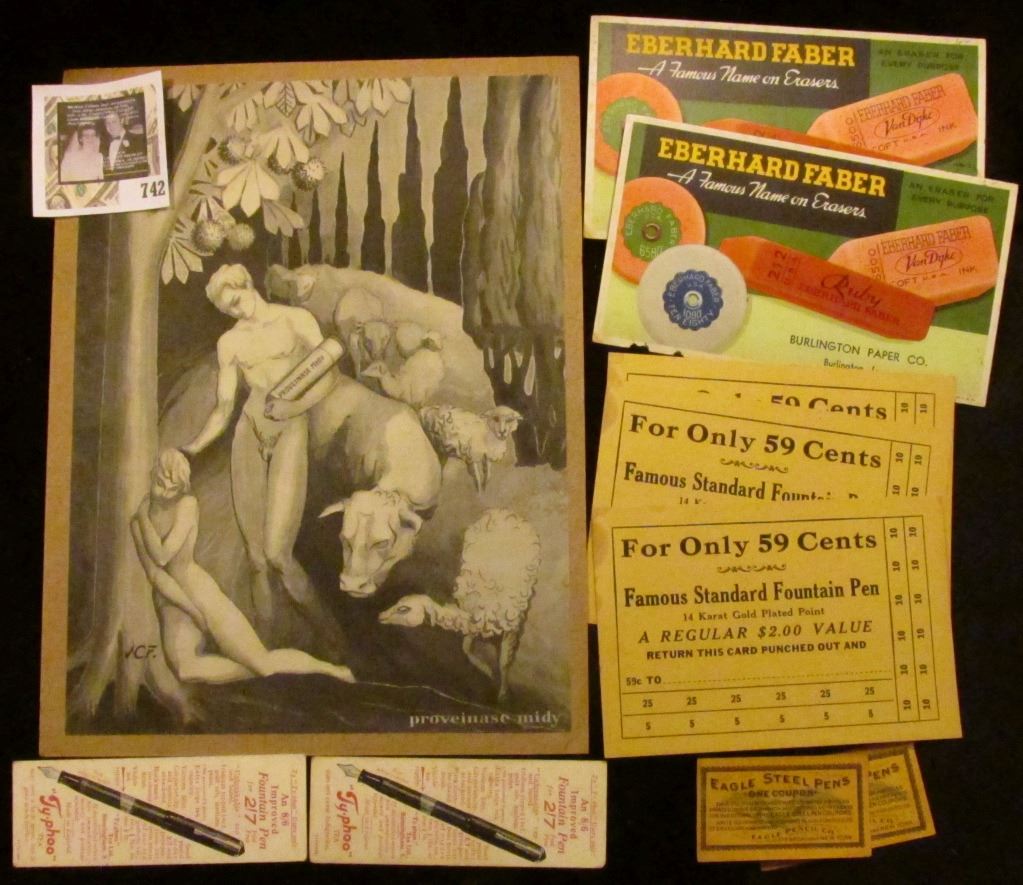 Plate 17 "Sections of Registered 5/20 of June 30/64" Heading $10,000, $5,000, "One Thousand" $100, $50 & "United States of America"; Steel engraved vignette "Proveinase Midy" Pen in hands of nude male comforting nude female leaning against tree while cattle and sheep mill around; several Fountain Pen Ink Blotters and advertising items;